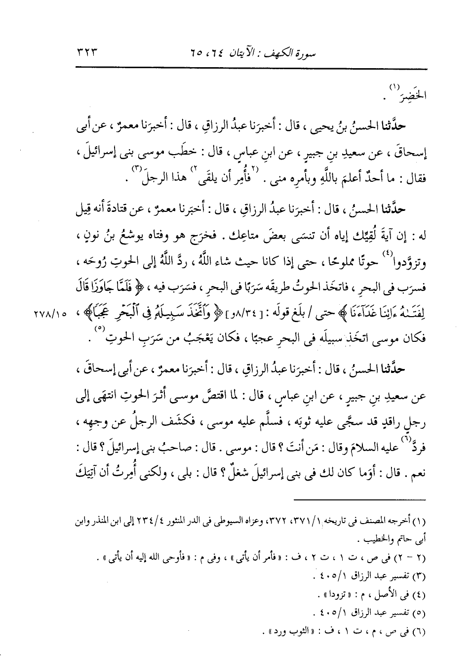 حَدَّثَنَا الْحَسَنُ بْنُ يَحْيَى، قَالَ: أَخْبَرَنَا عَبْدُ الرَّزَّاقِ، قَالَ: أَخْبَرَنَا مَعْمَرٌ، عَنْ أَبِي إِسْحَاقَ، عَنْ سَعِيدِ بْنِ جُبَيْرٍ، عَنِ ابْنِ عَبَّاسٍ، قَالَ: §خَطَبَ مُوسَى بَنِي إِسْرَائِيلَ، فَقَالَ: مَا أَحَدٌ أَعْلَمُ بِاللَّهِ وَبِأَمْرِهِ مِنِّي، فَأَوْحَى اللَّهُ إِلَيْهِ أَنْ يَأْتِيَ هَذَا الرَّجُلَ