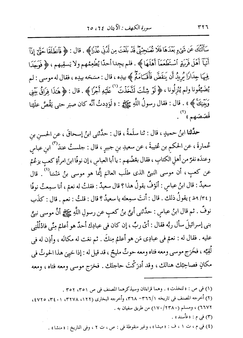 حَدَّثَنَا ابْنُ حُمَيْدٍ، قَالَ: ثنا سَلَمَةُ، قَالَ: ثنا ابْنُ إِسْحَاقَ، عَنِ الْحَسَنِ بْنِ عُمَارَةَ، عَنِ الْحَكَمِ بْنِ عُتَيْبَةَ، عَنْ سَعِيدِ بْنِ جُبَيْرٍ، قَالَ: §جَلَسْتُ فَأَسْنَدَ ابْنُ عَبَّاسٍ وَعِنْدَهُ نَفَرٌ مِنْ أَهْلِ الْكِتَابِ، فَقَالَ بَعْضُهُمْ: يَا أَبَا الْعَبَّاسِ، إِنَّ نَوْفًا ابْنَ امْرَأَةِ كَعْبٍ يَزْعُمُ عَنْ كَعْبٍ، أَنَّ مُوسَى النَّبِيَّ الَّذِي طَلَبَ الْعَالِمَ، إِنَّمَا هُوَ مُوسَى بْنُ مِيشَا. قَالَ سَعِيدٌ: قَالَ ابْنُ عَبَّاسٍ: أَنَوْفٌ يَقُولُ هَذَا؟ قَالَ سَعِيدٌ: فَقُلْتُ لَهُ نَعَمْ، أَنَا سَمِعْتُ نَوْفًا يَقُولُ ذَلِكَ، قَالَ: أَنْتَ سَمِعْتَهُ يَا سَعِيدُ؟ قَالَ: قُلْتُ: نَعَمْ، قَالَ: كَذَبَ نَوْفٌ