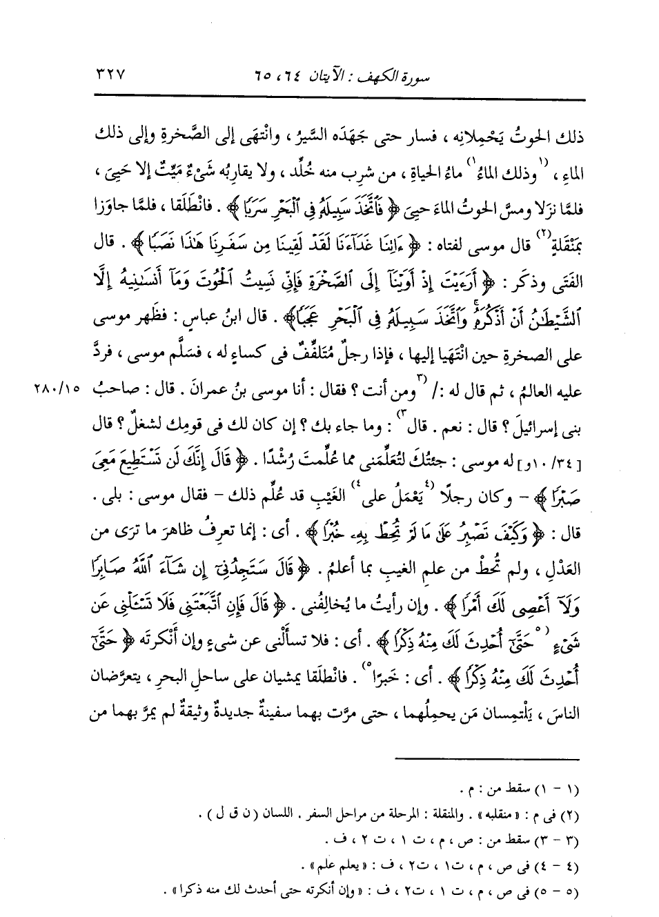 قَالَ ابْنُ عَبَّاسٍ: §فَظَهَرَ مُوسَى عَلَى الصَّخْرَةِ حِينَ انْتَهَيَا إِلَيْهَا، فَإِذَا رَجُلٌ مُتَلَفِّفٌ فِي كِسَاءٍ لَهُ، فَسَلَّمَ مُوسَى، فَرَدَّ عَلَيْهِ الْعَالِمُ، ثُمَّ قَالَ لَهُ: وَمَا جَاءَ بِكَ؟ إِنْ كَانَ لَكَ فِي قَوْمِكَ لَشُغْلٌ؟ قَالَ لَهُ مُوسَى: جِئْتُكَ لِتُعَلِّمَنِي مِمَّا عُلِّمْتَ رُشْدًا {قَالَ إِنَّكَ لَنْ تَسْتَطِيعَ مَعِيَ صَبْرًا} [الكهف: 67] وَكَانَ رَجُلًا يَعْلَمُ عِلْمَ الْغَيْبِ، قَدْ عُلِّمَ ذَلِكَ، فَقَالَ مُوسَى: بَلَى، قَالَ: {وَكَيْفَ تَصْبِرُ عَلَى مَا لَمْ تُحِطْ بِهِ خُبْرًا} [الكهف: 68] أَيْ إِنَّمَا تَعْرِفُ ظَاهَرَ مَا تَرَى مِنَ الْعَدْلِ، وَلَمْ تُحِطْ مِنْ عِلْمِ الْغَيْبِ بِمَا أَعْلَمُ {قَالَ سَتَجِدُنِي إِنْ شَاءَ اللَّهُ صَابِرًا وَلَا أَعْصِي لَكَ أَمْرًا} [الكهف: 69] وَإِنْ رَأَيْتَ مَا يُخَالِفُنِي {قَالَ فَإِنِ اتَّبَعْتَنِي فَلَا تَسْأَلْنِي عَنْ شَيْءٍ} [الكهف: 70] وَإِنْ أَنْكَرْتَهُ {حَتَّى أُحْدِثَ لَكَ مِنْهُ ذِكْرًا} [الكهف: 70] فَانْطَلَقَا يَمْشِيَانِ عَلَى سَاحِلِ الْبَحْرِ، يَتَعَرَّضَانِ النَّاسَ، يَلْتَمِسَانِ مَنْ يَحْمِلُهُمَا، حَتَّى مَرَّتْ بِهِمَا سَفِينَةٌ جَدِيدَةٌ وَثِيقَةٌ لَمْ يَمُرَّ بِهِمَا مِنَ -[328]- السُّفُنِ شَيْءٌ أَحْسَنَ وَلَا أَجْمَلَ وَلَا أَوْثَقَ مِنْهَا، فَسَأَلَا أَهْلَهَا أَنْ يَحْمِلُوهُمَا، فَحَمَلُوهُمَا، فَلَمَّا اطمأَنَّا فِيهَا، وَلَجَتْ بِهِمَا مَعَ أَهْلِهَا، أَخْرَجَ مِنْقَارًا لَهُ وَمَطْرَقَةً، ثُمَّ عَمَدَ إِلَى نَاحِيَةٍ مِنْهَا فَضَرَبَ فِيهَا بِالْمِنْقَارِ حَتَّى خَرَقَهَا، ثُمَّ أَخَذَ لَوْحًا فَطَبَّقَهُ عَلَيْهَا، ثُمَّ جَلَسَ عَلَيْهَا يُرَقِّعُهَا. قَالَ لَهُ مُوسَى وَرَأَى أَمْرًا فَظَعَ بِهِ: {أَخَرَقْتَهَا لِتُغْرِقَ أَهْلَهَا لَقَدْ جِئْتَ شَيْئًا إِمْرًا قَالَ أَلَمْ أَقُلْ إِنَّكَ لَنْ تَسْتَطِيعَ مَعِيَ صَبْرًا قَالَ لَا تُؤَاخِذْنِي بِمَا نَسِيتُ} [الكهف: 72] أَيْ مَا تَرَكْتُ مِنْ عَهْدِكَ {وَلَا تُرْهِقْنِي مِنْ أَمْرِي عُسْرًا} [الكهف: 73] ثُمَّ خَرَجَا مِنَ السَّفِينَةِ، فَانْطَلَقَا حَتَّى إِذَا أَتَيَا أَهْلَ قَرْيَةٍ فَإِذَا غِلْمَانٌ يَلْعَبُونَ خَلْفَهَا، فِيهِمْ غُلَامٌ لَيْسَ فِي الْغِلْمَانِ أَظْرَفُ مِنْهُ، وَلَا أَثَرَى وَلَا أَوْضَأَ مِنْهُ، فَأَخَذَهُ بِيَدِهِ، وَأَخَذَ حَجَرًا، قَالَ: فَضَرَبَ بِهِ رَأْسَهُ حَتَّى دَمَغَهُ فَقَتَلَهُ، قَالَ: فَرَأَى مُوسَى أَمْرًا فَظِيعًا لَا صَبْرَ عَلَيْهِ، صَبِيُّ صَغِيرٌ لَا ذَنْبَ لَهُ {قَالَ أَقَتَلْتَ نَفْسًا زَكِيَّةً بِغَيْرِ نَفْسٍ} [الكهف: 74] أَيْ صَغِيرَةً بِغَيْرِ نَفْسٍ {لَقَدْ جِئْتَ شَيْئًا نُكْرًا قَالَ أَلَمْ أَقُلْ لَكَ إِنَّكَ لَنْ تَسْتَطِيعَ مَعِيَ صَبْرًا قَالَ إِنْ سَأَلْتُكَ عَنْ شَيْءٍ بَعْدَهَا فَلَا تُصَاحِبْنِي قَدْ بَلَغْتَ مِنْ لَدُنِّي عُذْرًا} [الكهف: 74] أَيْ قَدْ أَعْذَرْتَ فِي شَأْنِي {فَانْطَلَقَا حَتَّى إِذَا أَتَيَا أَهْلَ قَرْيَةٍ اسْتَطْعَمَا أَهْلَهَا فَأَبَوْا أَنْ يُضَيِّفُوهُمَا فَوَجَدَا فِيهَا جِدَارًا يُرِيدُ أَنْ -[329]- يَنْقَضَّ} [الكهف: 77] فَهَدَمَهُ، ثُمَّ قَعَدَ يَبْنِيهِ، فَضَجِرَ مُوسَى مِمَّا رَآهُ يَصْنَعُ مِنَ التَّكْلِيفِ لِمَا لَيْسَ عَلَيْهِ صَبْرٌ، فَقَالَ: {لَوْ شِئْتَ لَاتَّخَذْتَ عَلَيْهِ أَجْرًا} [الكهف: 77] أَيْ قَدِ اسْتَطْعَمْنَاهُمْ فَلَمْ يُطْعِمُونَا، وَضِفْنَاهُمْ فَلَمْ يُضَيِّفُونَا، ثُمَّ قَعَدْتَ فِي غَيْرِ صَنِيعِهِ، وَلَوْ شِئْتَ لَأُعْطِيتَ عَلَيْهِ أَجْرًا فِي عَمَلِهِ {قَالَ هَذَا فِرَاقُ بَيْنِي وَبَيْنِكَ سَأُنَبِّئُكَ بِتَأْوِيلِ مَا لَمْ تَسْتَطِعْ عَلَيْهِ صَبْرًا أَمَّا السَّفِينَةُ فَكَانَتْ لِمَسَاكِينَ يَعْمَلُونَ فِي ال