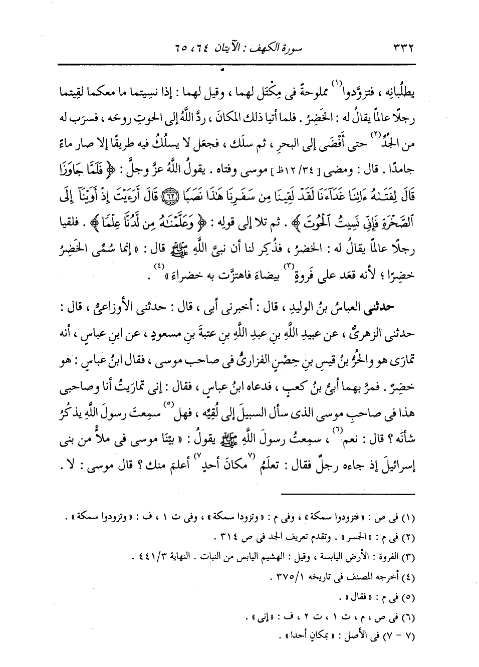 حَدَّثَنِي الْعَبَّاسُ بْنُ الْوَلِيدِ، قَالَ: ثنا أَبِي قَالَ: ثنا الْأَوْزَاعِيُّ، قَالَ: ثنا الزُّهْرِيُّ، عَنْ عُبَيْدِ اللَّهِ بْنِ عَبْدِ اللَّهِ بْنِ عُتْبَةَ بْنِ مَسْعُودٍ، عَنِ ابْنِ عَبَّاسٍ أَنَّهُ تَمَارَى هُوَ وَالْحُرُّ بْنُ قَيْسِ بْنِ حِصْنٍ الْفَزَارِيُّ فِي صَاحِبِ مُوسَى، فَقَالَ ابْنُ عَبَّاسٍ: هُوَ خَضِرٌ، فَمَرَّ بِهِمَا أُبَيُّ بْنُ كَعْبٍ، فَدَعَاهُ ابْنُ عَبَّاسٍ، فَقَالَ: إِنِّي تَمَارَيْتُ أنا وَصَاحِبِي هَذَا فِي صَاحِبِ مُوسَى الَّذِي سَأَلَ السَّبِيلَ إِلَى لُقْيِهِ، فَقَالَ سَمِعْتُ رَسُولَ اللَّهِ صَلَّى اللهُ عَلَيْهِ وَسَلَّمَ يَذْكُرُ شَأْنَهُ؟ قَالَ: إِنِّي سَمِعْتُ رَسُولَ اللَّهِ صَلَّى اللهُ عَلَيْهِ وَسَلَّمَ يَقُولُ: " §بَيْنَا مُوسَى فِي مَلَأٍ مِنْ بَنِي إِسْرَائِيلَ، إِذْ جَاءَهُ رَجُلٌ فَقَالَ: تَعْلَمْ مَكَانَ أَحَدٍ أَعْلَمُ مِنْكَ؟ قَالَ مُوسَى: لَا، -[333]- فَأَوْحَى اللَّهُ إِلَى مُوسَى: بَلَى عَبْدُنَا خَضِرٌ، فَسَأَلَ مُوسَى السَّبِيلَ إِلَى لُقِيِّهِ، فَجَعَلَ اللَّهُ لَهُ الْحُوتَ آيَةً، وَقِيلَ لَهُ: إِذَا فَقَدْتَ الْحُوتَ فَارْجِعْ فَإِنَّكَ سَتَلْقَاهُ، فَكَانَ مُوسَى يَتْبَعُ أَثَرَ الْحُوتِ فِي الْبَحْرِ، فَقَالَ فَتًى مُوسَى لِمُوسَى: أَرَأَيْتَ إِذْ أَوَيْنَا إِلَى الصَّخْرَةِ، فَإِنِّي نَسِيتُ الْحُوتَ، قَالَ مُوسَى: ذَلِكَ مَا كُنَّا نَبْغِ، فَارْتَدَّا عَلَى آثَارِهِمَا قَصَصًا، فَوَجَدَا عَبْدَنَا خَضِرًا، وَكَانَ مِنْ شَأْنِهِمَا مَا قَصَّ اللَّهُ فِي كِتَابِهِ " حَدَّثَنِي مُحَمَّدُ بْنُ مَرْزُوقٍ، قَالَ: ثنا الْحَجَّاجُ بْنُ الْمِنْهَالِ، قَالَ: ثنا عَبْدُ اللَّهِ بْنُ عُمَرَ النُّمَيْرِيُّ، عَنْ يُونُسَ بْنِ يَزِيدَ، قَالَ: سَمِعْتُ الزُّهْرِيَّ يُحَدِّثُ، قَالَ: أَخْبَرَنِي عُبَيْدُ اللَّهِ بْنُ عَبْدِ اللَّهِ بْنِ عُتْبَةَ بْنِ مَسْعُودٍ، عَنِ ابْنِ عَبَّاسٍ، أَنَّهُ تَمَارَى هُوَ وَالْحُرُّ بْنُ قَيْسِ بْنِ حِصْنٍ الْفَزَارِيُّ فِي صَاحِبِ مُوسَى، ثُمَّ ذَكَرَ نَحْوَ حَدِيثِ الْعَبَّاسِ، عَنْ أُبَيِّ بْنِ كَعْبٍ، عَنِ النَّبِيِّ صَلَّى اللهُ عَلَيْهِ وَسَلَّمَ