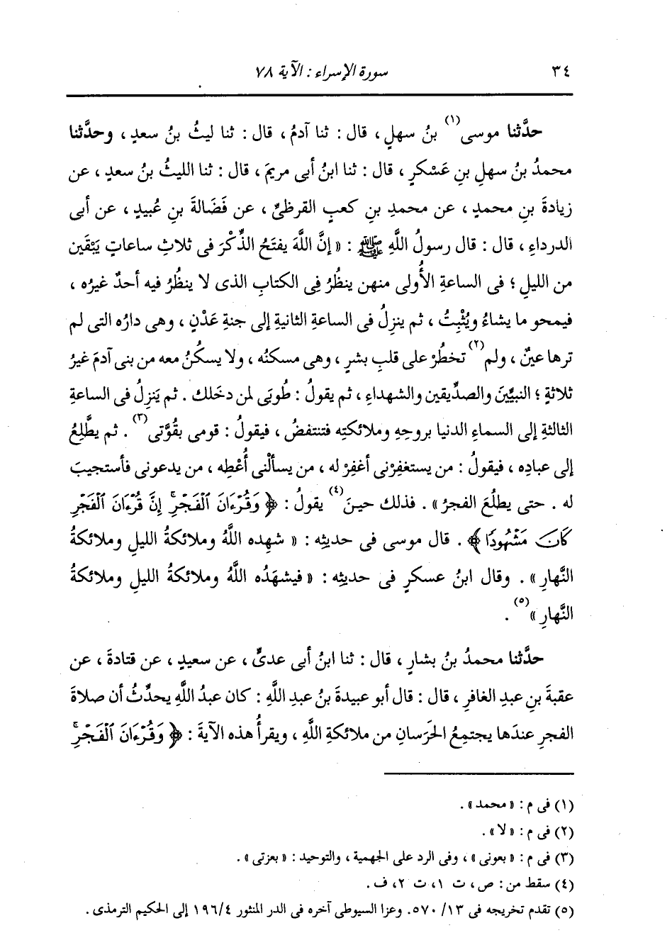 حَدَّثَنَا ابْنُ بَشَّارٍ، قَالَ: ثنا ابْنُ أَبِي عَدِيٍّ، عَنْ سَعِيدٍ، عَنْ قَتَادَةَ، عَنْ عُقْبَةَ بْنِ عَبْدِ الْغَافِرِ، قَالَ: قَالَ أَبُو عُبَيْدَةَ بْنُ عَبْدِ اللَّهِ: كَانَ عَبْدُ اللَّهِ يُحَدِّثُ أَنَّ §صَلَاةَ الْفَجْرِ عِنْدَهَا يَجْتَمِعُ الْحَرَسَانِ مِنْ مَلَائِكَةِ اللَّهِ، وَيَقْرَأُ هَذِهِ الْآيَةَ: {وَقُرْآنَ الْفَجْرِ -[35]- إِنَّ قُرْآنَ الْفَجْرِ كَانَ مَشْهُودًا} [الإسراء: 78]