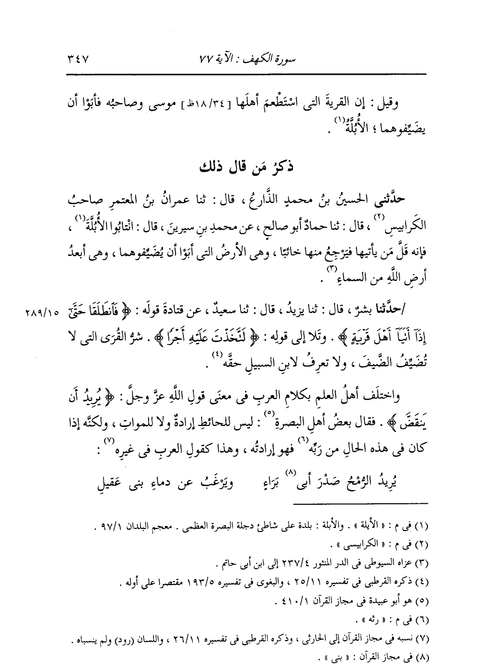 حَدَّثَنَا بِشْرٌ، قَالَ: ثنا يَزِيدُ، قَالَ: ثنا سَعِيدٌ، عَنْ قَتَادَةَ، قَوْلُهُ: {§فَانْطَلَقَا حَتَّى إِذَا أَتَيَا أَهْلَ قَرْيَةٍ} [الكهف: 77] وَتَلَا إِلَى قَوْلِهِ {لَاتَّخَذْتَ عَلَيْهِ أَجْرًا} [الكهف: 77] شَرُّ الْقُرَى الَّتِي لَا تُضِيفُ الضَّيْفَ، وَلَا تَعْرِفُ لِابْنِ السَّبِيلِ حَقَّهُ وَاخْتَلَفَ أَهْلُ الْعِلْمِ بِكَلَامِ الْعَرَبِ فِي مَعْنَى قَوْلِ اللَّهِ عَزَّ وَجَلَّ {يُرِيدُ أَنْ يَنْقَضَّ} [الكهف: 77] فَقَالَ بَعْضُ أَهْلِ الْبَصْرَةِ: لَيْسَ لِلْحَائِطِ إِرَادَةٌ وَلَا لِلْمَوَاتِ، وَلَكِنَّهُ إِذَا كَانَ فِي هَذِهِ الْحَالِ مِنْ رَثَّةٍ فَهُوَ إِرَادَتُهُ. وَهَذَا كَقَوْلِ الْعَرَبِ فِي غَيْرِهِ:
