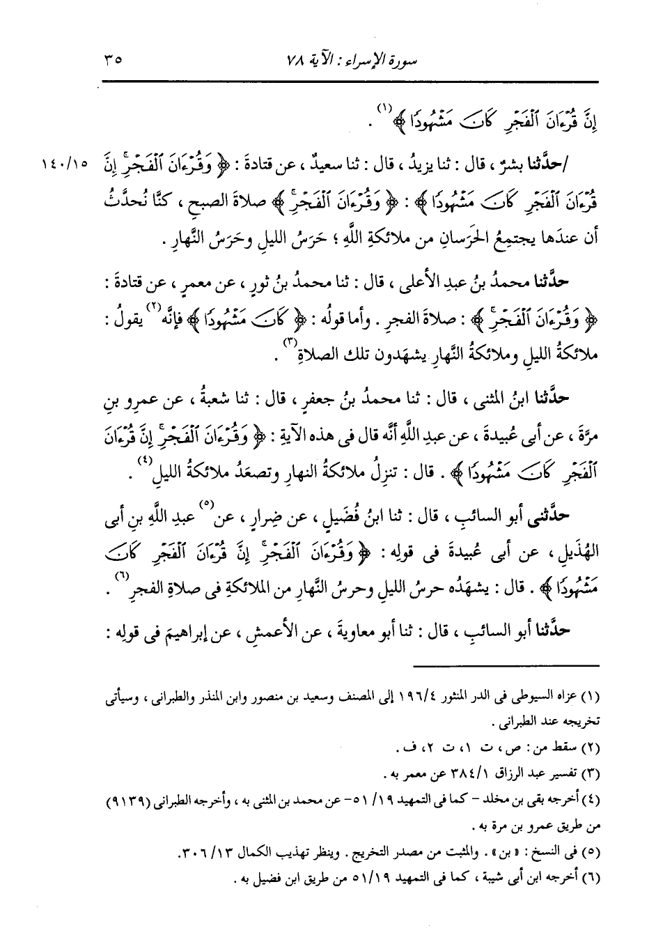 حَدَّثَنَا بِشْرٌ، قَالَ: ثنا يَزِيدُ، قَالَ: ثنا سَعِيدٌ، عَنْ قَتَادَةَ، {§وَقُرْآنَ الْفَجْرِ إِنَّ قُرْآنَ الْفَجْرِ كَانَ مَشْهُودًا} [الإسراء: 78] وَقُرْآنُ الْفَجْرِ: صَلَاةُ الصُّبْحِ، كُنَّا نُحَدِّثُ أَنَّ عِنْدَهَا يَجْتَمِعُ الْحَرَسَانِ مِنْ مَلَائِكَةِ اللَّهِ: حَرَسُ اللَّيْلِ، وَحَرَسُ النَّهَارِ