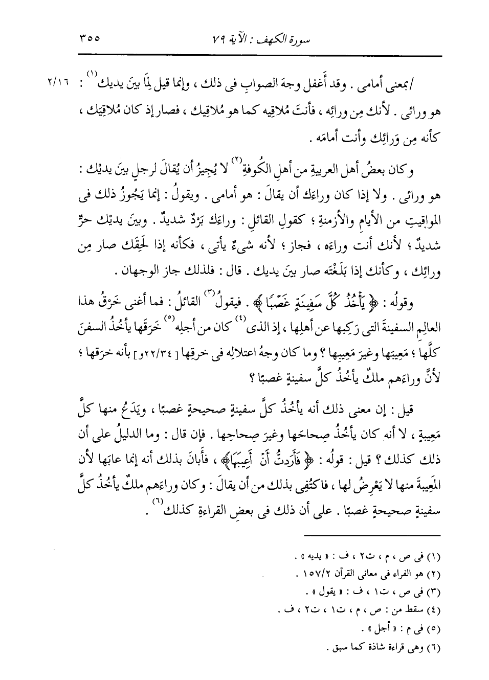 §وَقَوْلُهُ: {يَأْخُذُ كُلَّ سَفِينَةٍ غَصْبًا} [الكهف: 79] فَيَقُولُ الْقَائِلُ: فَمَا أَغْنَى خَرْقَ هَذَا الْعَالِمِ السَّفِينَةَ الَّتِي رَكِبَهَا عَنْ أَهْلِهَا، إِذْ كَانَ مِنْ أَجْلِ خَرْقِهَا يَأْخُذُ السُّفُنَ كُلَّهَا، مَعِيبُهَا وَغَيْرُ مَعِيبِهَا، وَمَا كَانَ وَجْهُ اعْتِلَالِهِ فِي خَرْقِهَا بِأَنَّهُ خَرَقَهَا، لِأَنَّ وَرَاءَهُمْ مَلِكٌ يَأْخُذُ كُلَّ سَفِينَةٍ غَصْبًا؟ قِيلَ: إِنَّ مَعْنَى ذَلِكَ، أَنَّهُ يَأْخُذُ كُلَّ سَفِينَةٍ صَحِيحَةٍ غَصْبًا، وَيَدَعُ مِنْهَا كُلَّ مَعِيبَةٍ، لَا أَنَّهُ كَانَ يَأْخُذُ صِحَاحَهَا وَغَيْرَ صِحَاحِهَا. فَإِنْ قَالَ: وَمَا الدَّلِيلُ عَلَى أَنَّ ذَلِكَ كَذَلِكَ؟ قِيلَ: قَوْلُهُ: {فَأَرَدْتُ أَنْ أَعِيبَهَا} [الكهف: 79] فَأَبَانَ بِذَلِكَ أَنَّهُ إِنَّمَا عَابَهَا، لِأَنَّ الْمَعِيبَةَ مِنْهَا لَا يَعْرِضُ لَهَا، فَاكْتَفَى بِذَلِكَ مِنْ أَنْ يُقَالَ: وَكَانَ وَرَاءَهُمْ مَلِكٌ يَأْخُذُ كُلَّ سَفِينَةٍ صَحِيحَةٍ غَصْبًا، عَلَى أَنَّ ذَلِكَ فِي بَعْضِ الْقِرَاءَاتِ كَذَلِكَ