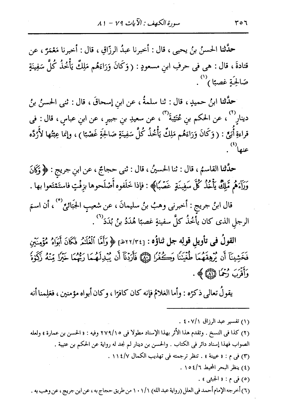 حَدَّثَنَا الْقَاسِمُ، قَالَ: ثنا الْحُسَيْنُ، قَالَ: ثني حَجَّاجٌ، عَنِ ابْنِ جُرَيْجٍ، {§وَكَانَ وَرَاءَهُمْ مَلِكٌ يَأْخُذُ كُلَّ سَفِينَةٍ غَصْبًا} [الكهف: 79] فَإِذَا خَلَّفُوهُ أَصْلَحُوهَا بِزِفْتٍ فَاسْتَمْتَعُوا بِهَا