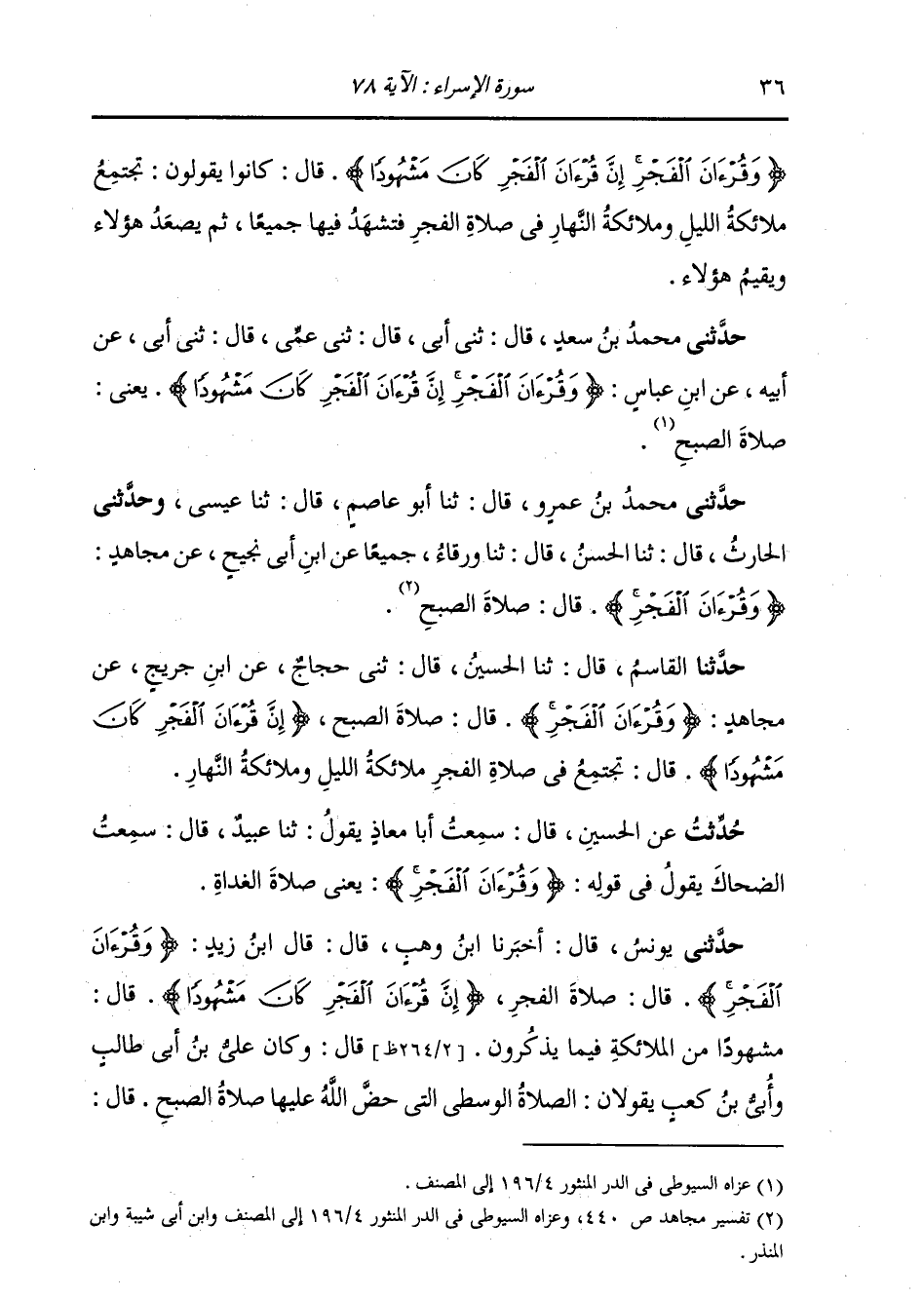 حَدَّثَنِي مُحَمَّدُ بْنُ عَمْرٍو، قَالَ: ثنا أَبُو عَاصِمٍ، قَالَ: ثنا عِيسَى، وَحَدَّثَنِي الْحَارِثُ، قَالَ: ثنا الْحَسَنُ، قَالَ: ثنا وَرْقَاءُ، جَمِيعًا عَنِ ابْنِ أَبِي نَجِيحٍ، عَنْ مُجَاهِدٍ، {§وَقُرْآنَ الْفَجْرِ} [الإسراء: 78] قَالَ: صَلَاةُ الصُّبْحِ