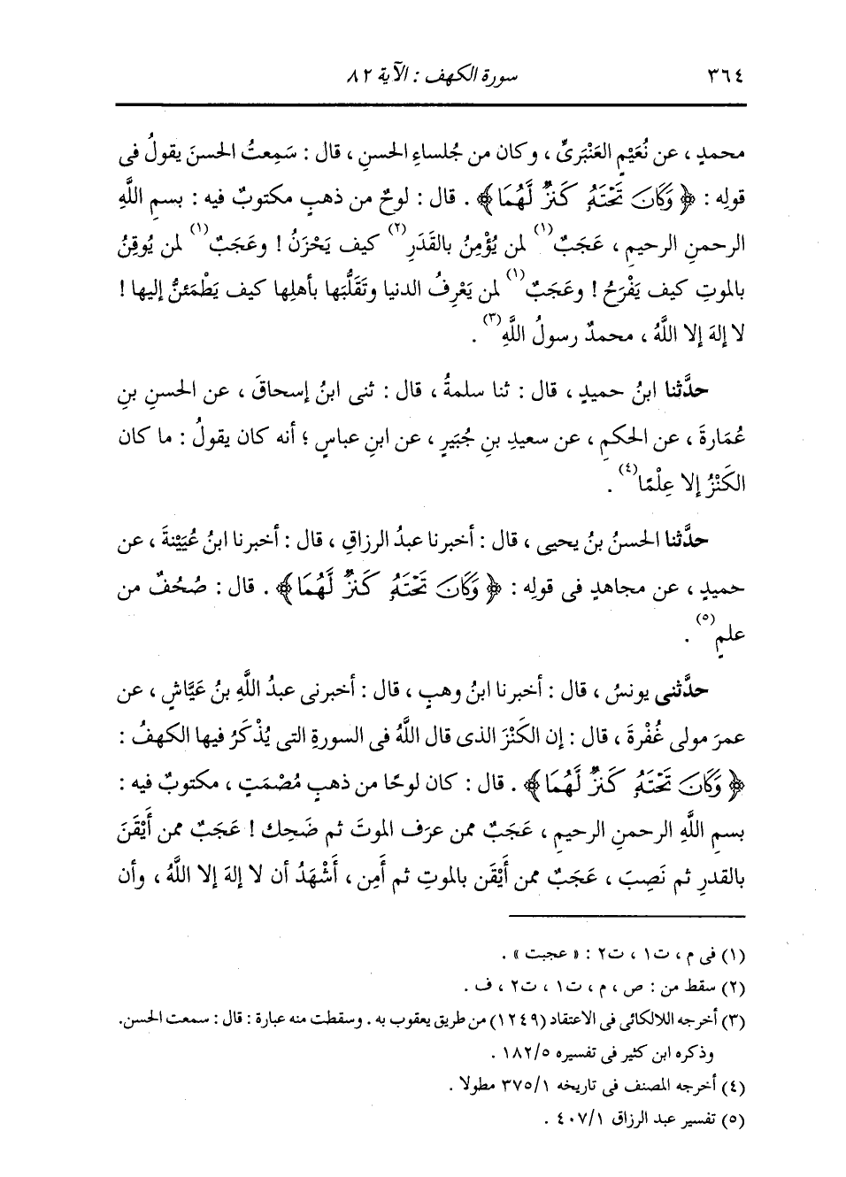 حَدَّثَنِي يُونُسُ، قَالَ: أَخْبَرَنَا ابْنُ وَهْبٍ، قَالَ: أَخْبَرَنِي عَبْدُ اللَّهِ بْنُ عَيَّاشٍ، عَنْ عُمَرَ، مَوْلَى غُفْرَةَ، قَالَ: §إِنَّ الْكَنْزَ الَّذِي قَالَ اللَّهُ فِي السُّورَةِ الَّتِي يُذْكَرُ فِيهَا الْكَهْفُ {وَكَانَ تَحْتَهُ كَنْزٌ لَهُمَا} [الكهف: 82] قَالَ: كَانَ لَوْحًا مِنْ ذَهَبٍ مُصْمَتٍ، مَكْتُوبًا فِيهِ: بِسْمِ اللَّهِ الرَّحْمَنِ الرَّحِيمِ: عَجَبٌ مِمَّنْ عَرَفَ الْمَوْتَ ثُمَّ ضَحِكَ، عَجَبٌ مِمَّنْ أَيْقَنَ بِالْقَدَرِ ثُمَّ نَصَبَ، عَجَبٌ مِمَّنْ أَيْقَنَّ بِالْمَوْتِ ثُمَّ أَمِنَ، أَشْهَدُ أَنْ لَا إِلَهَ إِلَّا اللَّهُ، وَأَنَّ -[365]- مُحَمَّدًا عَبْدُهُ وَرَسُولُهُ وَقَالَ آخَرُونَ: بَلْ كَانَ مَالًا مَكْنُوزًا