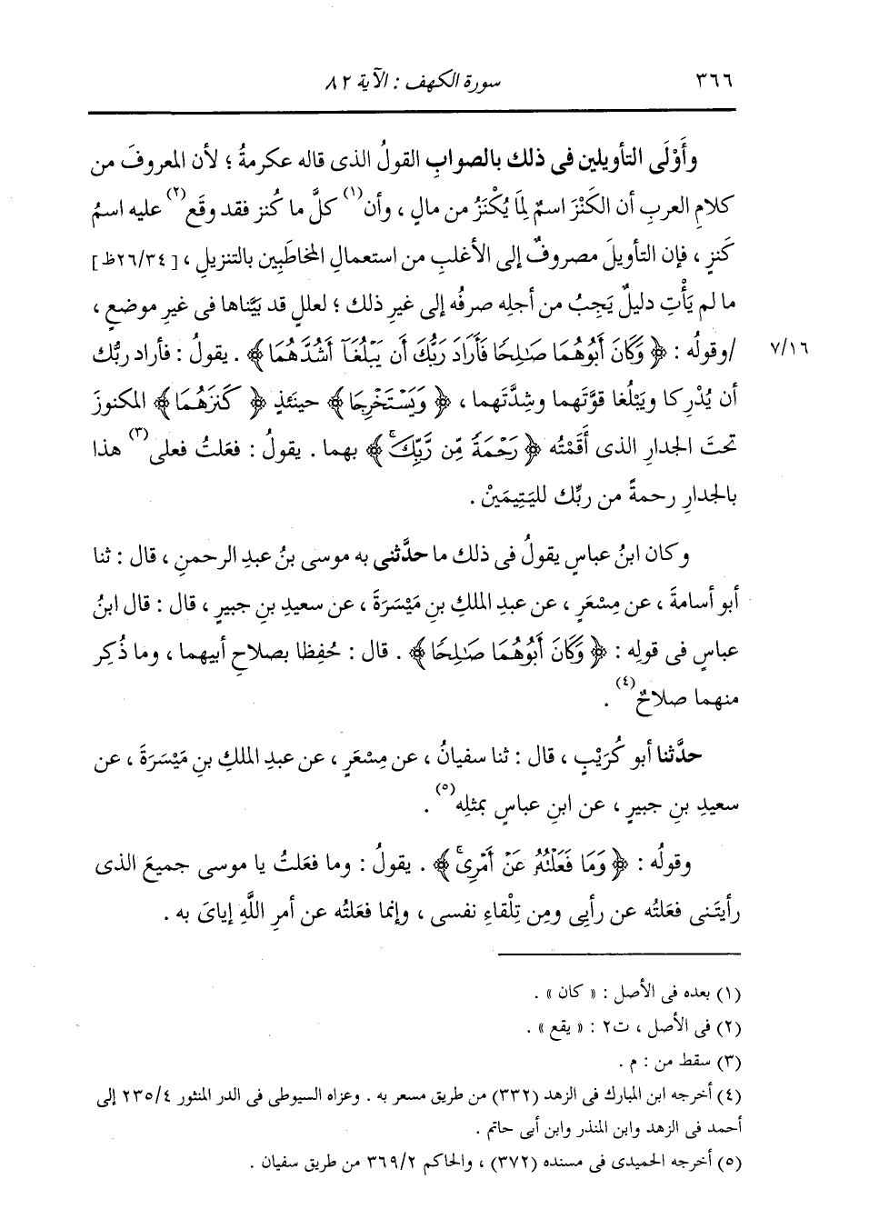 حَدَّثَنِي مُوسَى بْنُ عَبْدِ الرَّحْمَنِ، قَالَ: ثنا أَبُو أُسَامَةَ، عَنْ مِسْعَرٍ، عَنْ عَبْدِ الْمَلِكِ بْنِ مَيْسَرَةَ، عَنْ سَعِيدِ بْنِ جُبَيْرٍ، قَالَ: قَالَ ابْنُ عَبَّاسٍ، فِي قَوْلِهِ {§وَكَانَ أَبُوهُمَا صَالِحًا} [الكهف: 82] قَالَ: حُفِظَا بِصَلَاحِ أَبِيهِمَا، وَمَا ذُكِرَ مِنْهُمَا صَلَاحٌ حَدَّثَنَا أَبُو كُرَيْبٍ، قَالَ: ثنا سُفْيَانُ، عَنْ مِسْعَرٍ، عَنْ عَبْدِ الْمَلِكِ بْنِ مَيْسَرَةَ، عَنْ سَعِيدِ بْنِ جُبَيْرٍ، عَنِ ابْنِ عَبَّاسٍ، بِمِثْلِهِ