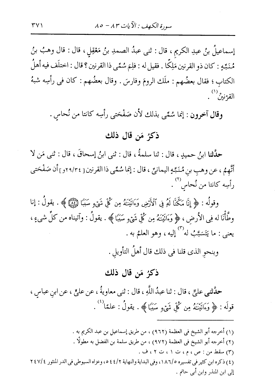 ذِكْرُ مَنْ قَالَ ذَلِكَ: حَدَّثَنَا ابْنُ حُمَيْدٍ، قَالَ: ثنا سَلَمَةُ، قَالَ: ثني ابْنُ إِسْحَاقَ، قَالَ: ثني مَنْ لَا أَتَّهِمُ عَنْ وَهْبِ بْنِ مُنَبِّهٍ الْيَمَانِيِّ، قَالَ: إِنَّمَا §سُمِّيَ ذَا الْقَرْنَيْنِ أَنَّ صَفْحَتَيْ رَأْسِهِ كَانَتَا مِنْ نُحَاسِ