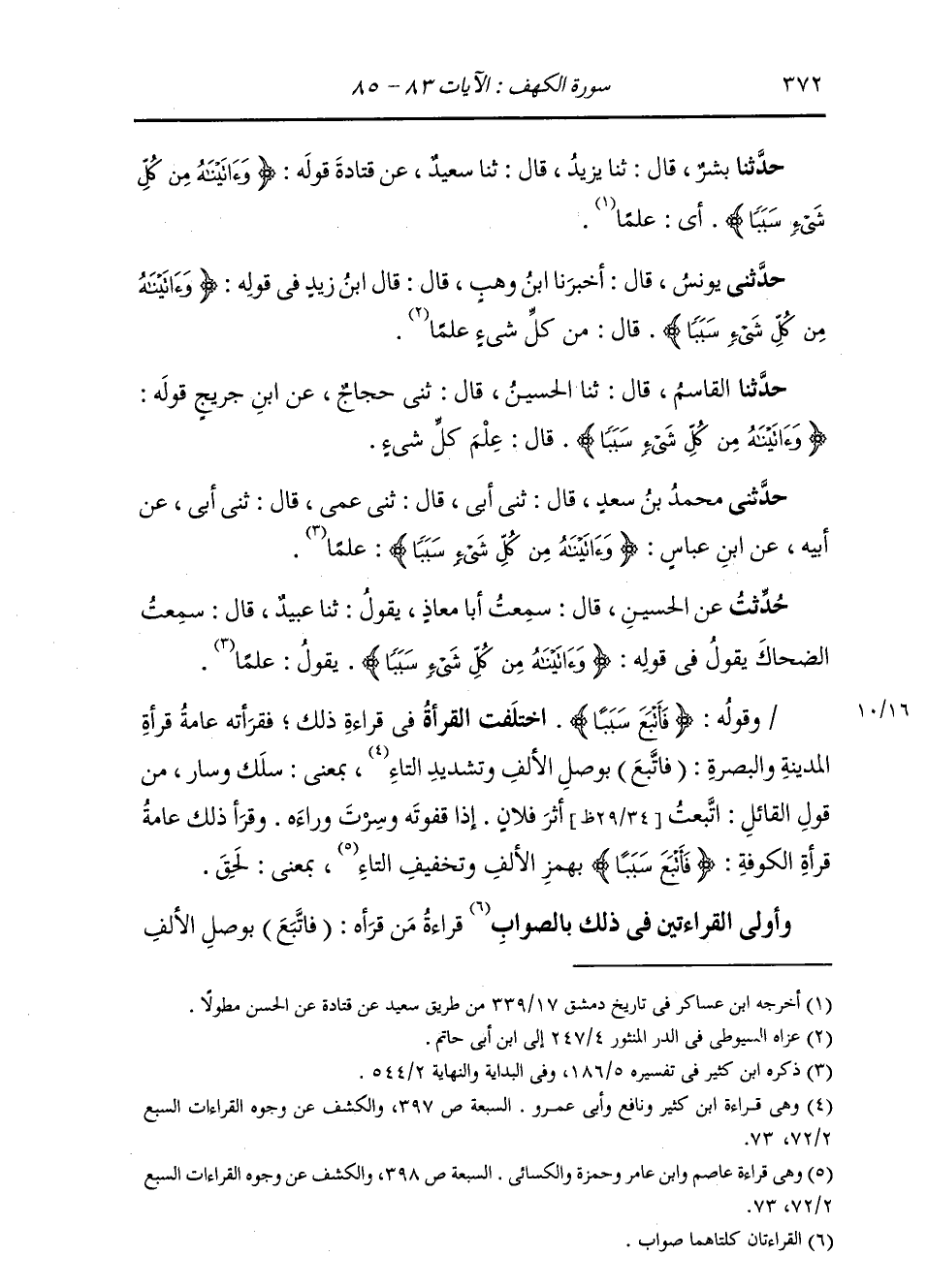 حَدَّثَنَا بِشْرٌ، قَالَ: ثنا يَزِيدُ، قَالَ ثنا سَعِيدٌ، عَنْ قَتَادَةَ، قَوْلُهُ: {§وَآتَيْنَاهُ مِنْ كُلِّ شَيْءٍ سَبَبًا} [الكهف: 84] أَيْ عِلْمًا