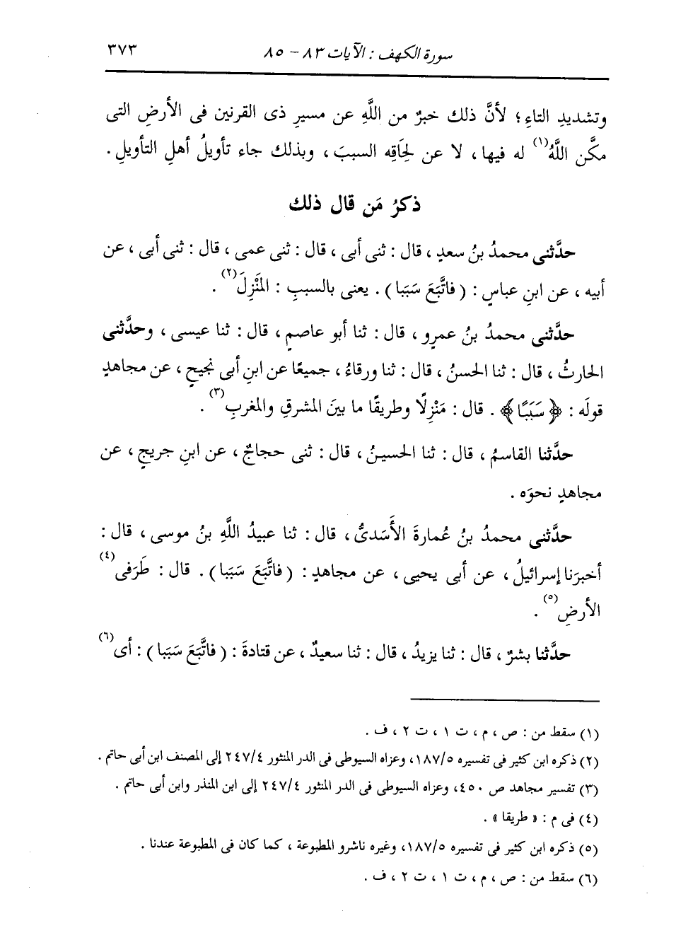 حَدَّثَنِي مُحَمَّدُ بْنُ عَمْرٍو، قَالَ: ثنا أَبُو عَاصِمٍ، قَالَ: ثنا عِيسَى، وَحَدَّثَنِي الْحَارِثُ، قَالَ: ثنا الْحَسَنُ، قَالَ: ثنا وَرْقَاءُ، جَمِيعًا عَنِ ابْنِ أَبِي نَجِيحٍ، عَنْ مُجَاهِدٍ، فِي قَوْلِهِ: {§سَبَبًا} [الكهف: 84] قَالَ: مَنْزِلًا وَطَرِيقًا مَا بَيْنَ الْمَشْرِقِ وَالْمَغْرِبِ حَدَّثَنِي الْقَاسِمُ، قَالَ: ثنا الْحُسَيْنُ، قَالَ: ثني حَجَّاجٌ، عَنِ ابْنِ جُرَيْجٍ، عَنْ مُجَاهِدٍ، نَحْوَهُ
