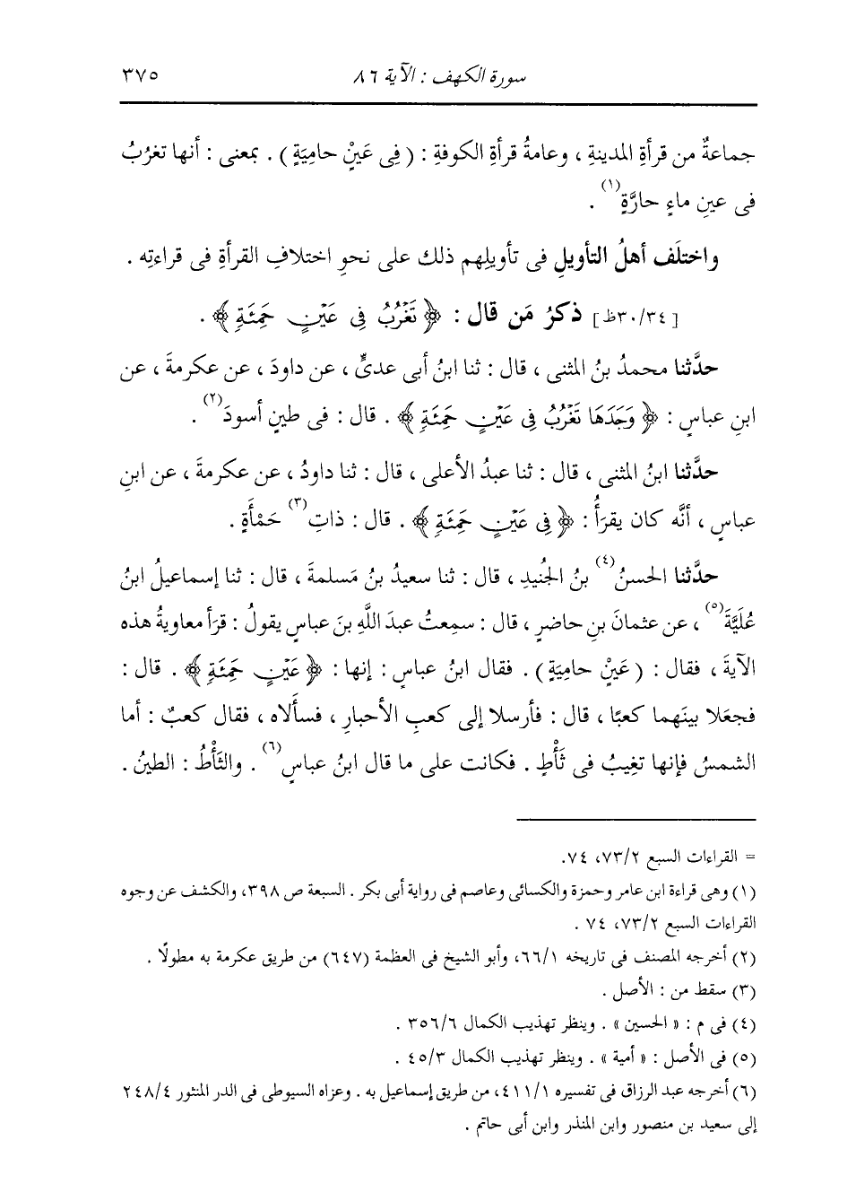 ذِكْرُ مَنْ قَالَ ذَلِكَ: {تَغْرُبُ فِي عَيْنٍ حَمِئَةٍ} [الكهف: 86] : حَدَّثَنَا مُحَمَّدُ بْنُ الْمُثَنَّى قَالَ: ثنا ابْنُ أَبِي عَدِيٍّ، عَنْ دَاوُدَ، عَنْ عِكْرِمَةَ، عَنِ ابْنِ عَبَّاسٍ، {§وَجَدَهَا تَغْرُبُ فِي عَيْنٍ حَمِئَةٍ} [الكهف: 86] قَالَ: فِي طِينٍ أَسْوَدَ