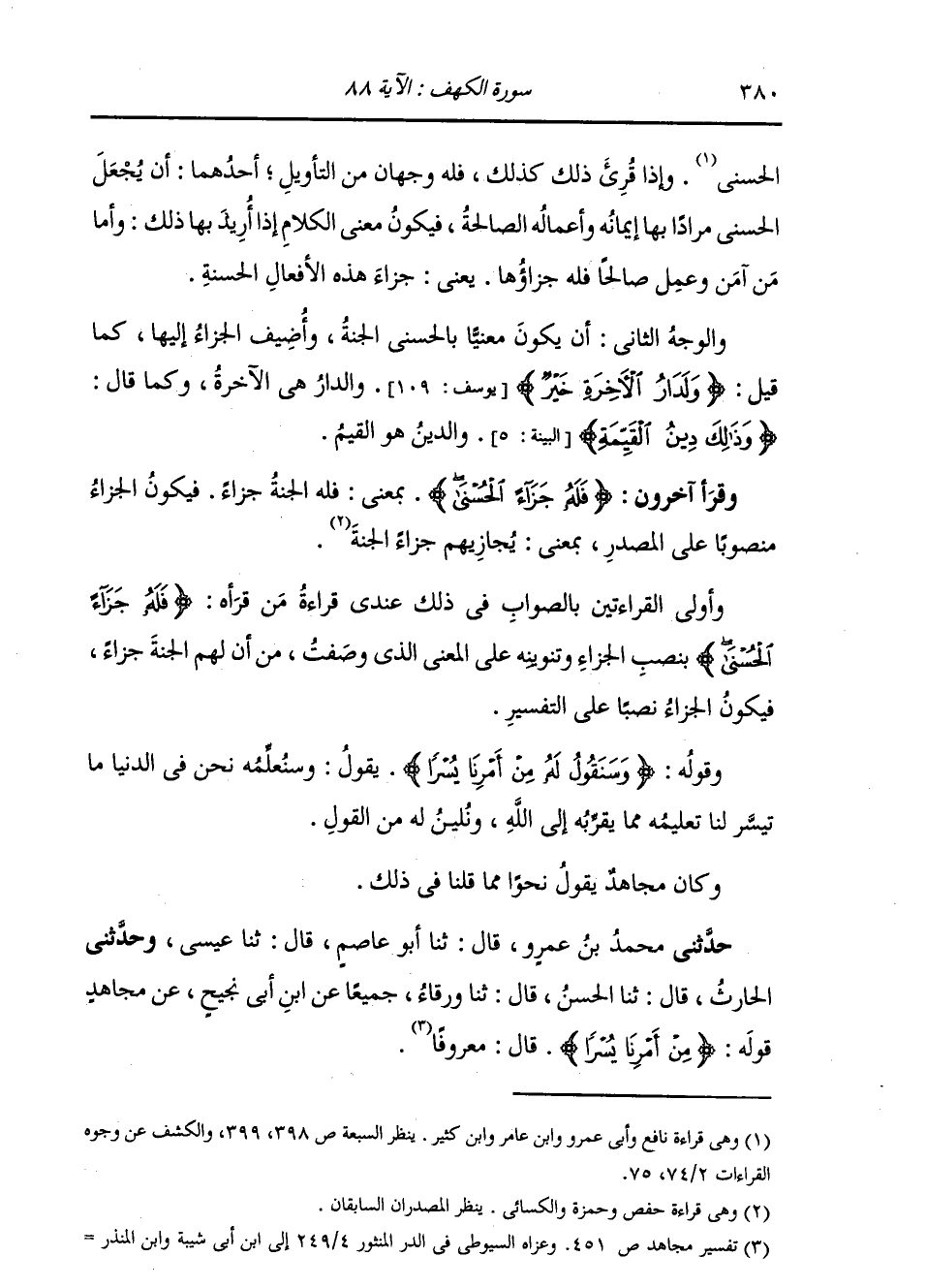 حَدَّثَنِي مُحَمَّدُ بْنُ عَمْرٍو، قَالَ: ثنا أَبُو عَاصِمٍ، قَالَ: ثنا عِيسَى، ح، وَحَدَّثَنِي الْحَارِثُ، قَالَ: ثنا الْحَسَنُ، قَالَ: ثنا وَرْقَاءُ، جَمِيعًا عَنِ ابْنِ أَبِي نَجِيحٍ، عَنْ مُجَاهِدٍ، قَوْلُهُ: {§مِنْ أَمْرِنَا يُسْرًا} [الكهف: 88] قَالَ: مَعْرُوفًا -[381]- حَدَّثَنَا الْقَاسِمُ، قَالَ: ثنا الْحُسَيْنُ، قَالَ: ثني حَجَّاجٌ، عَنِ ابْنِ جُرَيْجٍ، عَنْ مُجَاهِدٍ، مِثْلَهُ