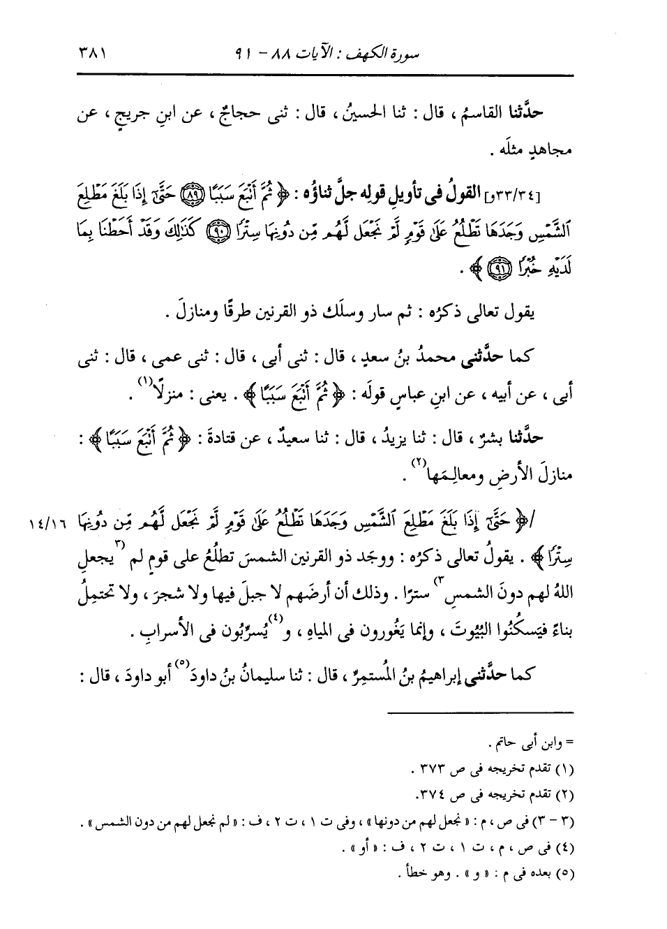 §الْقَوْلُ فِي تَأْوِيلِ قَوْلِهِ تَعَالَى: {ثُمَّ أَتْبَعَ سَبَبًا حَتَّى إِذَا بَلَغَ مَطْلِعَ الشَّمْسِ وَجَدَهَا تَطْلُعُ عَلَى قَوْمٍ لَمْ نَجْعَلْ لَهُمْ مِنْ دُونِهَا سِتْرًا كَذَلِكَ وَقَدْ أَحَطْنَا بِمَا لَدَيْهِ خُبْرًا} [الكهف: 90] يَقُولُ تَعَالَى ذِكْرُهُ: ثُمَّ سَارَ وَسَلَكَ ذُو الْقَرْنَيْنِ طُرُقًا وَمَنَازِلَ، كَمَا: