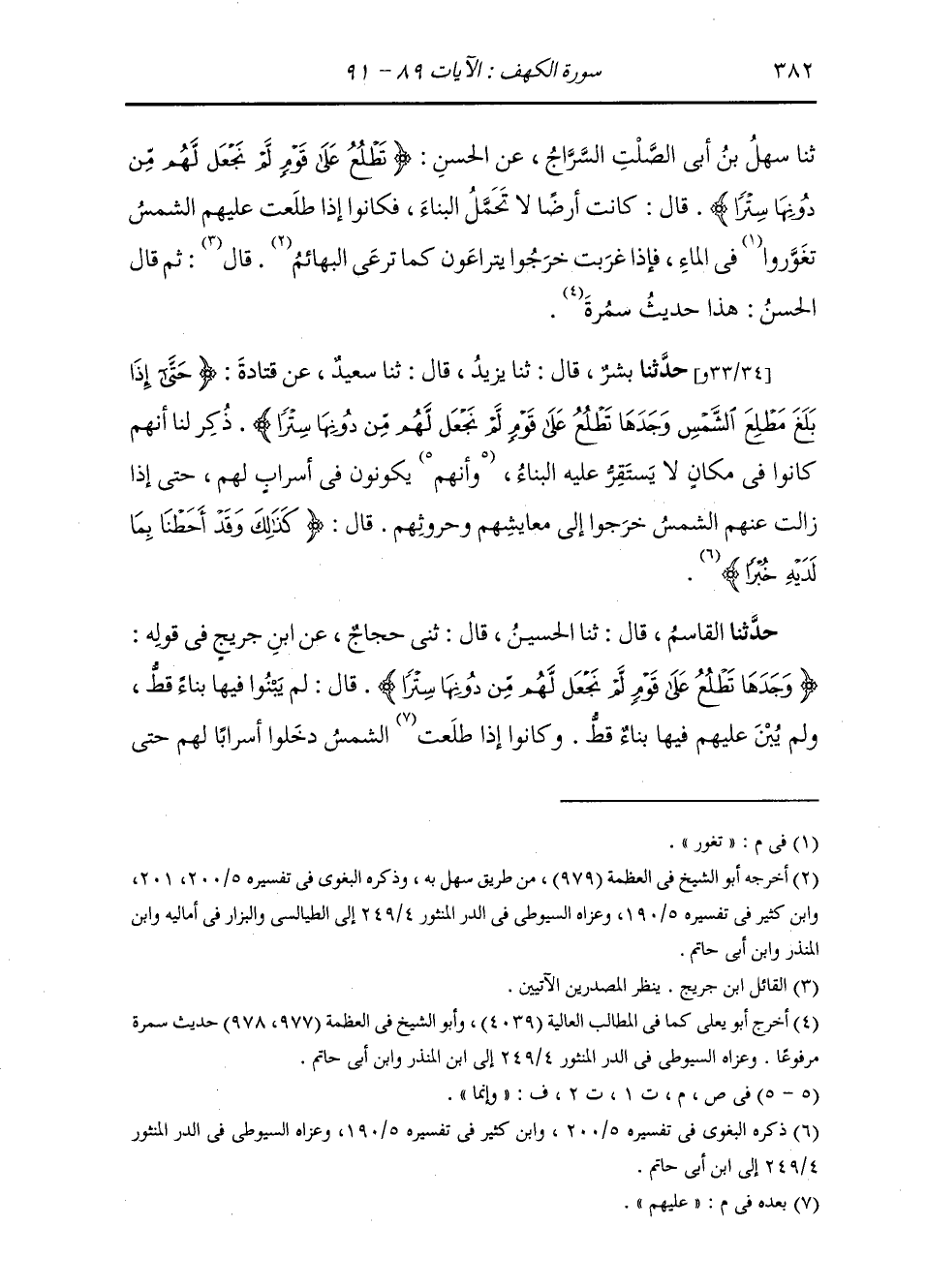 حَدَّثَنَا بِشْرٌ، قَالَ: ثنا يَزِيدُ، قَالَ: ثنا سَعِيدٌ، عَنْ قَتَادَةَ، {§حَتَّى إِذَا بَلَغَ مَطْلِعَ الشَّمْسِ وَجَدَهَا تَطْلُعُ عَلَى قَوْمٍ لَمْ نَجْعَلْ لَهُمْ مِنْ دُونِهَا سِتْرًا} [الكهف: 90] ذُكِرَ لَنَا أَنَّهُمْ كَانُوا فِي مَكَانٍ لَا يَسْتَقِرُّ عَلَيْهِ الْبِنَاءُ، وَإِنَّمَا يَكُونُونَ فِي أَسْرَابٍ لَهُمْ، حَتَّى إِذَا زَالَتْ عَنْهُمُ الشَّمْسُ خَرَجُوا إِلَى مَعَايِشِهِمْ وَحُرُوثِهِمْ، قَالَ: كَذَلِكَ وَقَدْ أَحَطْنَا بِمَا لَدَيْهِ خُبْرًا