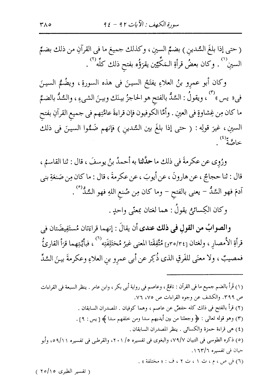 : (حَتَّى إِذَا بَلَغَ بَيْنَ السُّدَّيْنِ) بِضَمِّ السِّينِ وَكَذَلِكَ جَمِيعُ مَا فِي الْقُرْآنِ مِنْ ذَلِكَ بِضَمِّ السِّينِ. وَكَانَ بَعْضُ قُرَّاءِ الْمَكِّيِّينَ يَقْرَؤُهُ بِفَتْحِ ذَلِكَ كُلِّهِ. وَكَانَ أَبُو عَمْرِو بْنُ الْعَلَاءِ يَفْتَحُ السِّينَ فِي هَذِهِ السُّورَةِ، وَيَضُمُّ السِّينَ فِي يس، وَيَقُولُ: السَّدُّ بِالْفَتْحِ: هُوَ الْحَاجِزُ بَيْنَكَ وَبَيْنَ الشَّيْءِ، وَالسُّدُّ بِالضَّمِّ: مَا كَانَ مِنْ غِشَاوَةٍ فِي الْعَيْنِ. وَأَمَّا الْكُوفِيُّونَ فَإِنَّ قِرَاءَةَ عَامَّتِهِمْ فِي جَمِيعِ الْقُرْآنِ بِفَتْحِ السِّينِ غَيْرَ قَوْلِهِ: (حَتَّى إِذَا بَلَغَ بَيْنَ السُّدَّيْنِ) فَإِنَّهُمْ ضَمُّوا السِّينَ فِي ذَلِكَ خَاصَّةً. وَرُوِي عَنْ عِكْرِمَةَ فِي ذَلِكَ مَا: