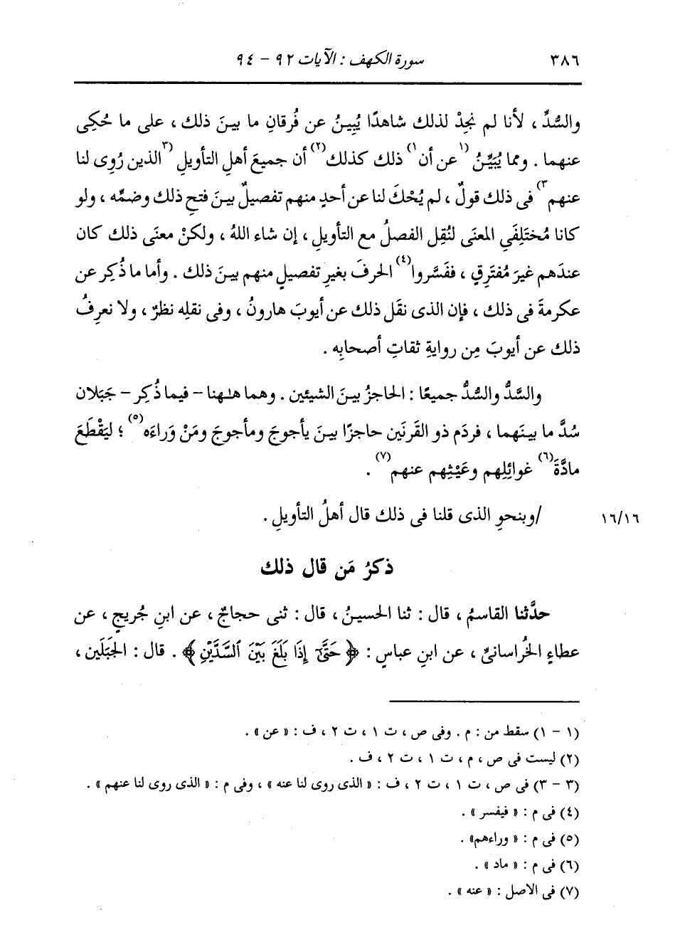 وَالسُّدِّ، لَأَنَّا لَمْ نَجِدْ لِذَلِكَ شَاهِدًا يُبَيِّنُ عَنْ فُرْقَانِ مَا بَيْنَ ذَلِكَ عَلَى مَا حُكِيَ عَنْهُمَا. وَمَا يُبَيِّنُ ذَلِكَ أَنَّ جَمِيعَ أَهْلِ التَّأْوِيلِ الَّذِي رُوِيَ لَنَا عَنْهُمْ فِي ذَلِكَ قَوْلٌ، لَمْ يُحْكَ لَنَا عَنْ أَحَدٍ مِنْهُمْ تَفْصِيلٌ بَيْنَ فَتْحِ ذَلِكَ وَضَمِّهِ، وَلَوْ كَانَا مُخْتَلَفَيِ الْمَعْنَى لَنُقِلَ الْفَصْلُ مَعَ التَّأْوِيلِ إِنْ شَاءَ اللَّهُ، وَلَكِنْ مَعْنَى ذَلِكَ كَانَ عِنْدَهُمْ غَيْرُ مُفْتَرِقٍ، فَيُفَسَّرُ الْحَرْفُ بِغَيْرِ تَفْصِيلٍ مِنْهُمْ بَيْنَ ذَلِكَ. وَأَمَّا مَا ذُكِرَ عَنْ عِكْرِمَةَ فِي ذَلِكَ، فَإِنَّ الَّذِي نَقَلَ ذَلِكَ عَنْ أَيُّوبَ وَهَارُونَ وَفِي نَقْلِهِ نَظَرٌ، وَلَا نَعْرِفُ ذَلِكَ عَنْ أَيُّوبَ مِنْ رِوَايَةِ ثِقَاتِ أَصْحَابِهِ. وَالسَّدُّ وَالسُّدُّ جَمِيعًا: الْحَاجِزُ بَيْنَ الشَّيْئَيْنِ، وَهُمَا هَهُنَا فِيمَا ذُكِرَ جَبَلَانِ سُدَّ مَا بَيْنَهُمَا، فَرَدَمَ ذُو الْقَرْنَيْنِ حَاجِزًا بَيْنَ يَأْجُوجَ وَمَأْجُوجَ وَمَنْ وَرَاءَهُمْ، لِيَقْطَعَ مَادَّ غَوَائِلِهِمْ وَعَيْثِهِمْ عَنْهُمْ. وَبِنَحْوِ الَّذِي قُلْنَا فِي ذَلِكَ قَالَ أَهْلُ التَّأْوِيلِ