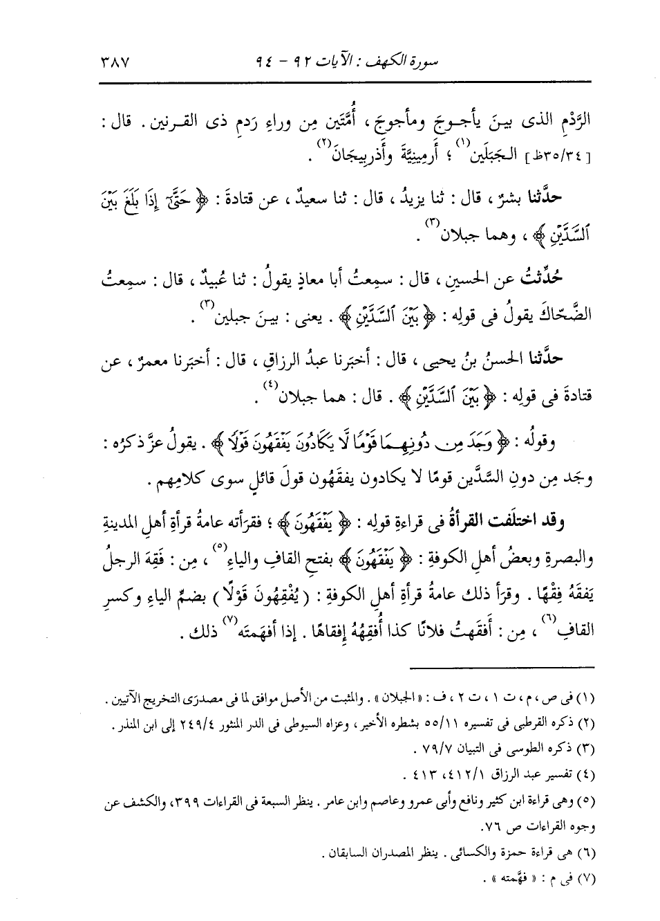 §وَقَوْلُهُ {وَجَدَ مِنْ دُونِهِمَا قَوْمًا لَا يَكَادُونَ يَفْقَهُونَ قَوْلًا} [الكهف: 93] يَقُولُ عَزَّ ذِكْرُهُ: وَجَدَ مِنْ دُونِ السَّدَّيْنِ قَوْمًا لَا يَكَادُونَ يَفْقَهُونَ قَوْلَ قَائِلٍ سِوَى كَلَامِهِمْ. وَقَدِ اخْتَلَفَتِ الْقُرَّاءُ فِي قِرَاءَةِ قَوْلِهِ {يَفْقَهُونَ} [النساء: 78] فَقَرَأَتْهُ عَامَّةُ قُرَّاءِ أَهْلِ الْمَدِينَةِ وَالْبَصْرَةِ وَبَعْضُ أَهْلِ الْكُوفَةِ {يَفْقَهُونَ قَوْلًا} [الكهف: 93] بِفَتْحِ الْقَافِ وَالْيَاءِ، مِنْ فَقِهَ الرَّجُلِ يَفْقَهُ فِقْهًا. وَقَرَأَ ذَلِكَ عَامَّةُ قُرَّاءِ أَهْلِ الْكُوفَةِ (يُفْقِهُونَ قَوْلًا) بِضَمِّ الْيَاءِ وَكَسْرِ الْقَافِ: مِنْ أَفْقَهْتُ فُلَانًا كَذَا أُفْقِهُهُ إِفْقَاهًا: إِذَا فَهَّمْتُهُ ذَلِكَ.