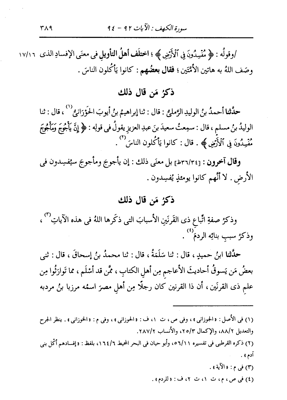 ذِكْرُ مَنْ قَالَ ذَلِكَ: حَدَّثَنَا أَحْمَدُ بْنُ الْوَلِيدِ الرَّمْلِيُّ، قَالَ: ثنا إِبْرَاهِيمُ بْنُ أَيُّوبَ الْخُوزَانِيُّ، قَالَ: ثنا الْوَلِيدُ بْنُ مُسْلِمٍ، قَالَ: سَمِعْتُ سَعِيدَ بْنَ عَبْدِ الْعَزِيزِ، يَقُولُ فِي قَوْلِهِ {§إِنَّ يَأْجُوجَ وَمَأْجُوجَ مُفْسِدُونَ فِي الْأَرْضِ} [الكهف: 94] قَالَ: كَانُوا يَأْكُلُونَ النَّاسَ وَقَالَ آخَرُونَ: بَلْ مَعْنَى ذَلِكَ: أَنْ يَأْجُوجَ وَمَأْجُوجَ سَيُفْسِدُونَ فِي الْأَرْضِ لَا أَنَّهُمْ كَانُوا يَوْمَئِذٍ يُفْسِدُونَ. ذِكْرُ مَنْ قَالَ ذَلِكَ، وَذِكْرُ صِفَةِ اتِّبَاعِ ذِي الْقَرْنَيْنِ الْأَسْبَابَ الَّتِي ذَكَرَهَا اللَّهُ فِي هَذِهِ الْآيَةِ، وَذِكْرُ سَبَبِ بِنَائِهِ لِلرَّدْمِ: