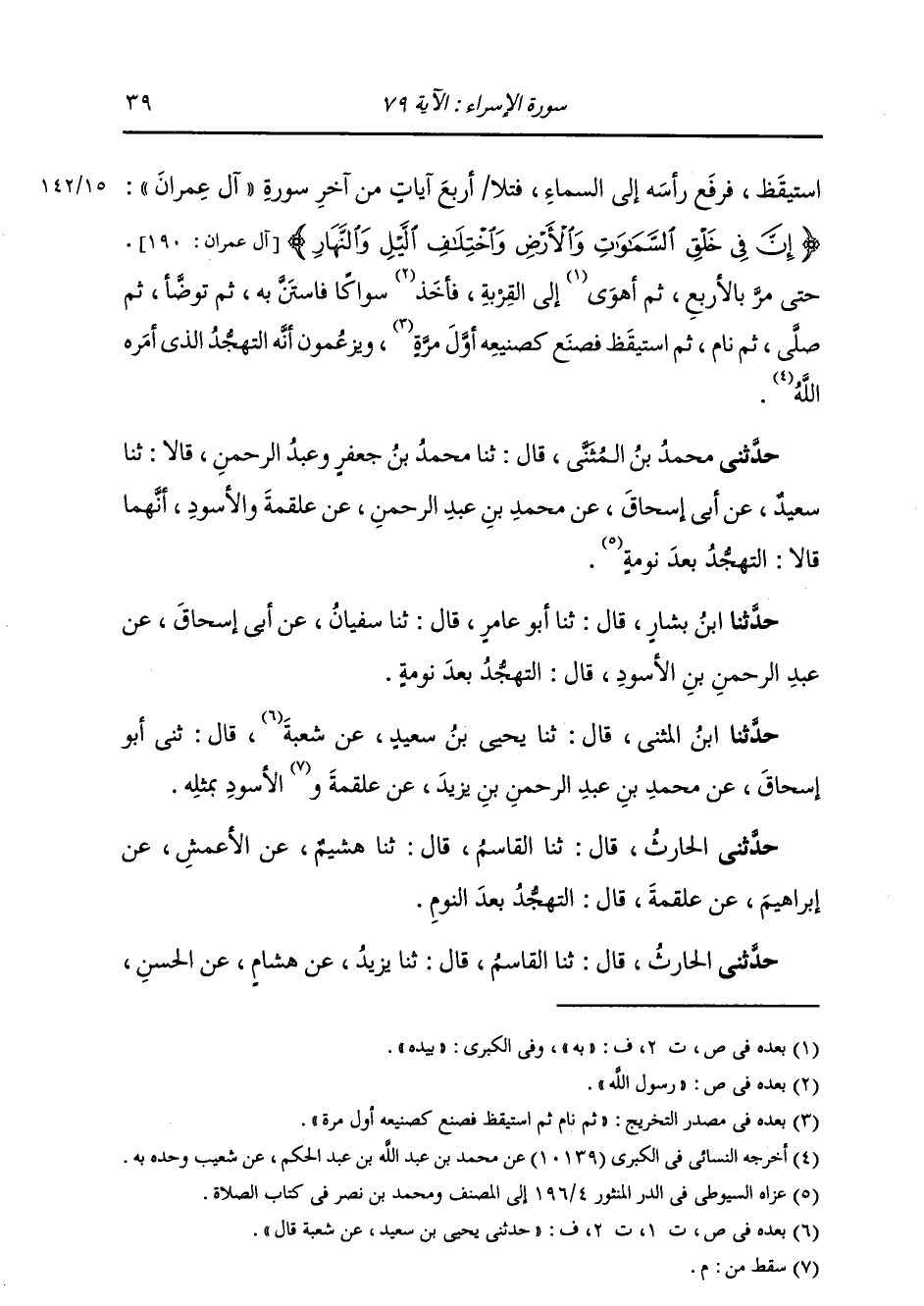 حَدَّثَنَا ابْنُ بَشَّارٍ، قَالَ: ثنا أَبُو عَامِرٍ، قَالَ: ثنا سُفْيَانُ، عَنْ أَبِي إِسْحَاقَ، عَنْ عَبْدِ الرَّحْمَنِ بْنِ الْأَسْوَدِ، قَالَ: §التَّهَجُّدُ: بَعْدَ نَوْمَةٍ حَدَّثَنَا ابْنُ الْمُثَنَّى ثنا قَالَ: ثنا يَحْيَى بْنُ سَعِيدٍ، عَنْ شُعْبَةَ، قَالَ: ثني أَبُو إِسْحَاقَ، عَنْ مُحَمَّدِ بْنِ عَبْدِ الرَّحْمَنِ بْنِ يَزِيدَ، عَنْ عَلْقَمَةَ، وَالْأَسْوَدِ، بِمِثْلِهِ