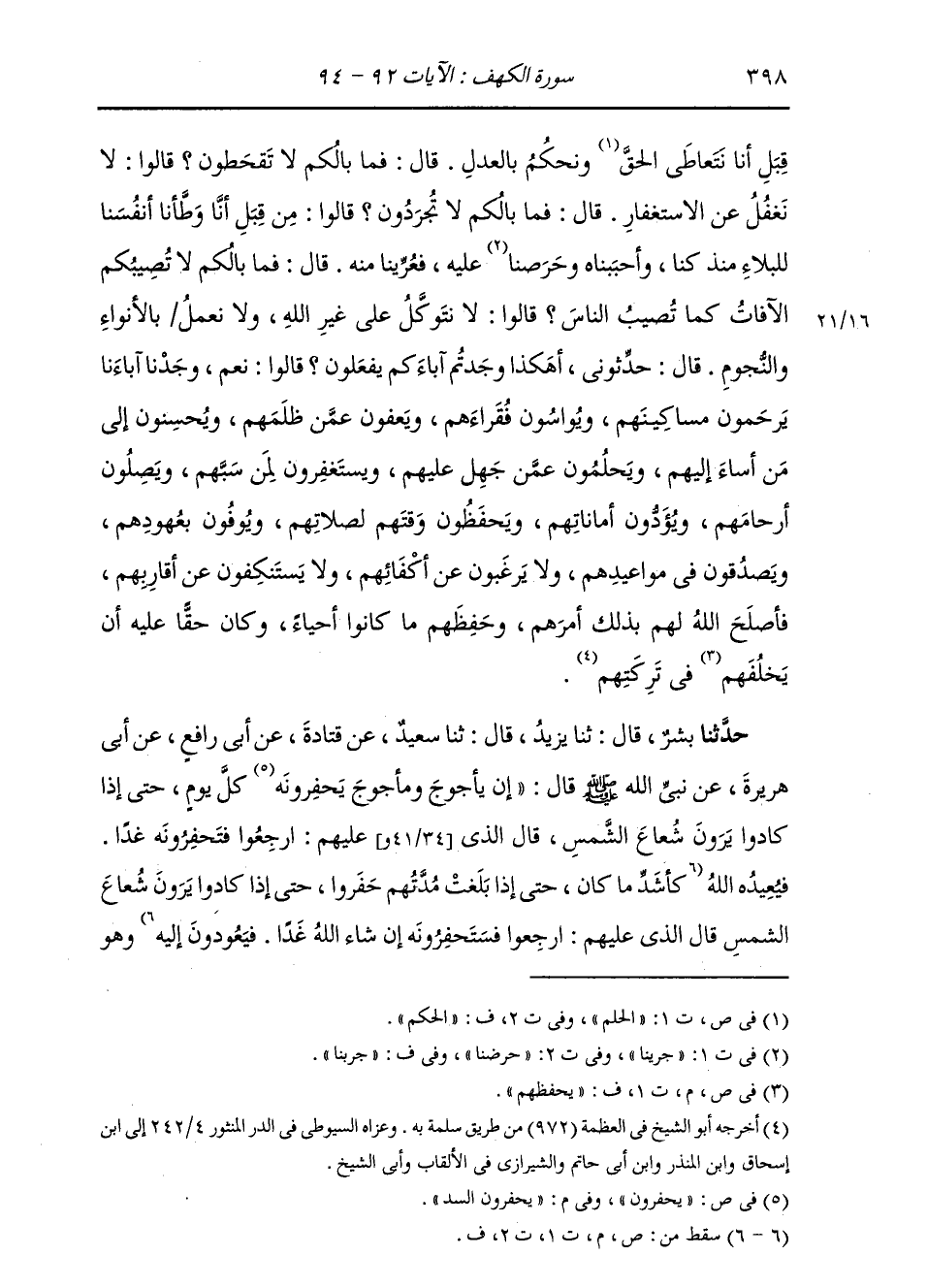 حَدَّثَنَا بِشْرٌ، قَالَ: ثنا يَزِيدُ، قَالَ: ثنا سَعِيدٌ، عَنْ قَتَادَةَ، عَنْ أَبِي رَافِعٍ، عَنْ أَبِي هُرَيْرَةَ، عَنْ نَبِيِّ اللَّهِ صَلَّى اللهُ عَلَيْهِ وَسَلَّمَ: " إِنَّ §يَأْجُوجَ وَمَأْجُوجَ يَحْفِرُونَ السَّدَّ كُلَّ يَوْمٍ، حَتَّى إِذَا كَادُوا يَرَوْنَ شُعَاعَ الشَّمْسِ قَالَ الَّذِي عَلَيْهِمُ ارْجِعُوا فَتَحْفِرُونَهُ غَدًا، فَيُعِيدُهُ اللَّهُ وَهُوَ -[399]- كَهَيْئَتِهِ يَوْمَ تَرَكُوهُ، حَتَّى إِذَا جَاءَ الْوَقْتُ قَالَ: إِنْ شَاءَ اللَّهُ، فَيَحْفِرُونَهُ وَيَخْرُجُونَ عَلَى النَّاسِ، فَيُنْشِفُونَ الْمِيَاهَ، وَيَتَحَصَّنُ النَّاسُ فِي حُصُونِهِمْ، فَيَرْمُونَ بِسِهَامِهِمْ إِلَى السَّمَاءِ، فَيَرْجِعُ فِيهَا كَهَيْئَةِ الدِّمَاءِ، فَيَقُولُونَ: قَهَرْنَا أَهْلَ الْأَرْضِ، وَعَلَوْنَا أَهْلَ السَّمَاءِ، فَيَبْعَثُ اللَّهُ عَلَيْهِمْ نَغَفًا فِي أَقْفَائِهِمْ فَتَقْتُلُهُمْ " فَقَالَ رَسُولُ اللَّهِ صَلَّى اللهُ عَلَيْهِ وَسَلَّمَ: «وَالَّذِي نَفْسُ مُحَمَّدٍ بِيَدِهِ إِنَّ دَوَابَّ الْأَرْضِ لَتَسْمَنُ وَتَشْكُرُ مِنْ لُحُومِهِمْ»