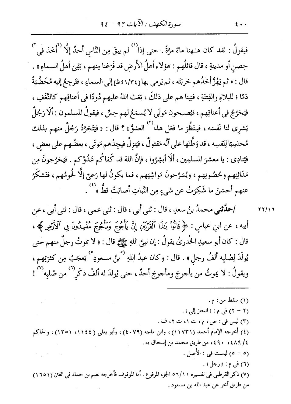 حَدَّثَنِي مُحَمَّدُ بْنُ سَعْدٍ، قَالَ: ثني أَبِي، قَالَ: ثني عَمِي، قَالَ ثني أَبِي، عَنْ أَبِيهِ، عَنِ ابْنِ عَبَّاسٍ: {قَالُوا يَا ذَا الْقَرْنَيْنِ إِنَّ يَأْجُوجَ وَمَأْجُوجَ مُفْسِدُونَ فِي الْأَرْضِ} [الكهف: 94] قَالَ: كَانَ أَبُو سَعِيدٍ الْخُدْرِيُّ يَقُولُ: إِنَّ نَبِيَّ اللَّهِ صَلَّى اللهُ عَلَيْهِ وَسَلَّمَ قَالَ: «§لَا يَمُوتُ رَجُلٌ مِنْهُمْ حَتَّى يُولَدَ لِصُلْبِهِ أَلْفُ رَجُلٍ»