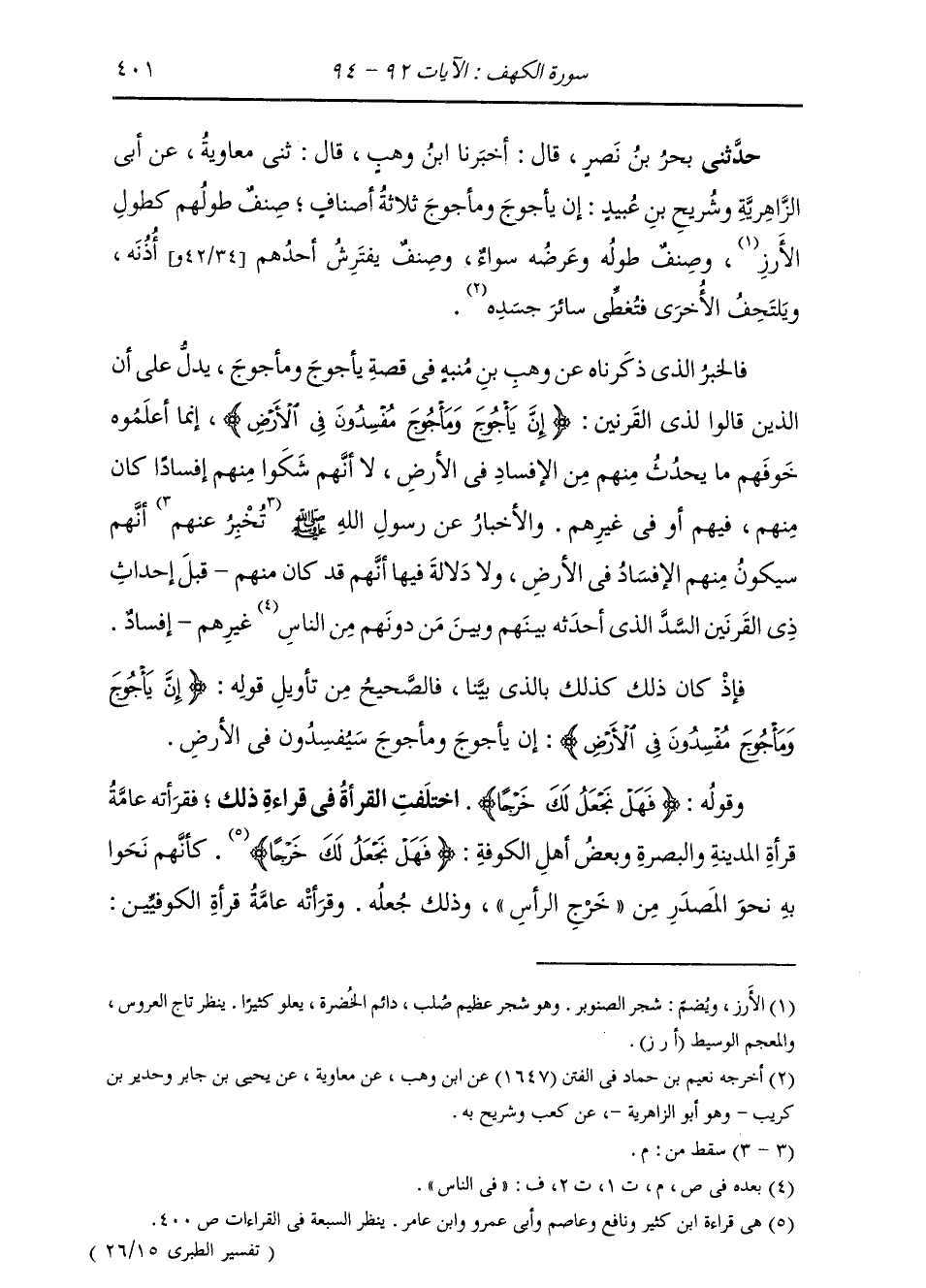 فَالْخَبَرُ الَّذِي ذَكَرْنَاهُ عَنْ وَهْبِ بْنِ مُنَبِّهِ فِي قِصَّةِ يَأْجُوجَ وَمَأْجُوجَ، يَدُلُّ عَلَى أَنَّ الَّذِينَ قَالُوا لِذِي الْقَرْنَيْنِ {إِنَّ يَأْجُوجَ وَمَأْجُوجَ مُفْسِدُونَ فِي الْأَرْضِ} [الكهف: 94] إِنَّمَا أَعْلَمُوهُ خَوْفَهُمْ مَا يَحْدُثُ مِنْهُمْ مِنَ الْإِفْسَادِ فِي الْأَرْضِ، لَا أَنَّهُمْ شَكَوْا مِنْهُمْ فَسَادًا كَانَ مِنْهُمْ فِيهِمْ أَوْ فِي غَيْرِهِمْ، وَالْأَخْبَارُ عَنْ رَسُولِ اللَّهِ صَلَّى اللهُ عَلَيْهِ وَسَلَّمَ أَنَّهُمْ سَيَكُونُ مِنْهُمُ الْإِفْسَادُ فِي الْأَرْضِ، وَلَا دَلَالَةَ فِيهَا أَنَّهُمْ قَدْ كَانَ مِنْهُمْ قَبْلَ إِحْدَاثِ ذِي الْقَرْنَيْنِ السَّدَّ الَّذِي أَحْدَثَهُ بَيْنَهُمْ وَبَيْنَ مَنْ دُونَهُمْ مِنَ النَّاسِ فِي النَّاسِ غَيْرِهِمْ إِفْسَادٌ. فَإِذَا كَانَ ذَلِكَ كَذَلِكَ بِالَّذِي بَيَّنَّا، فَالصَّحِيحُ مِنْ تَأْوِيلِ قَوْلِهِ {إِنَّ يَأْجُوجَ وَمَأْجُوجَ مُفْسِدُونَ فِي الْأَرْضِ} [الكهف: 94] إِنَّ يَأْجُوجَ وَمَأْجُوجَ سَيُفْسِدُونَ فِي الْأَرْضِ
