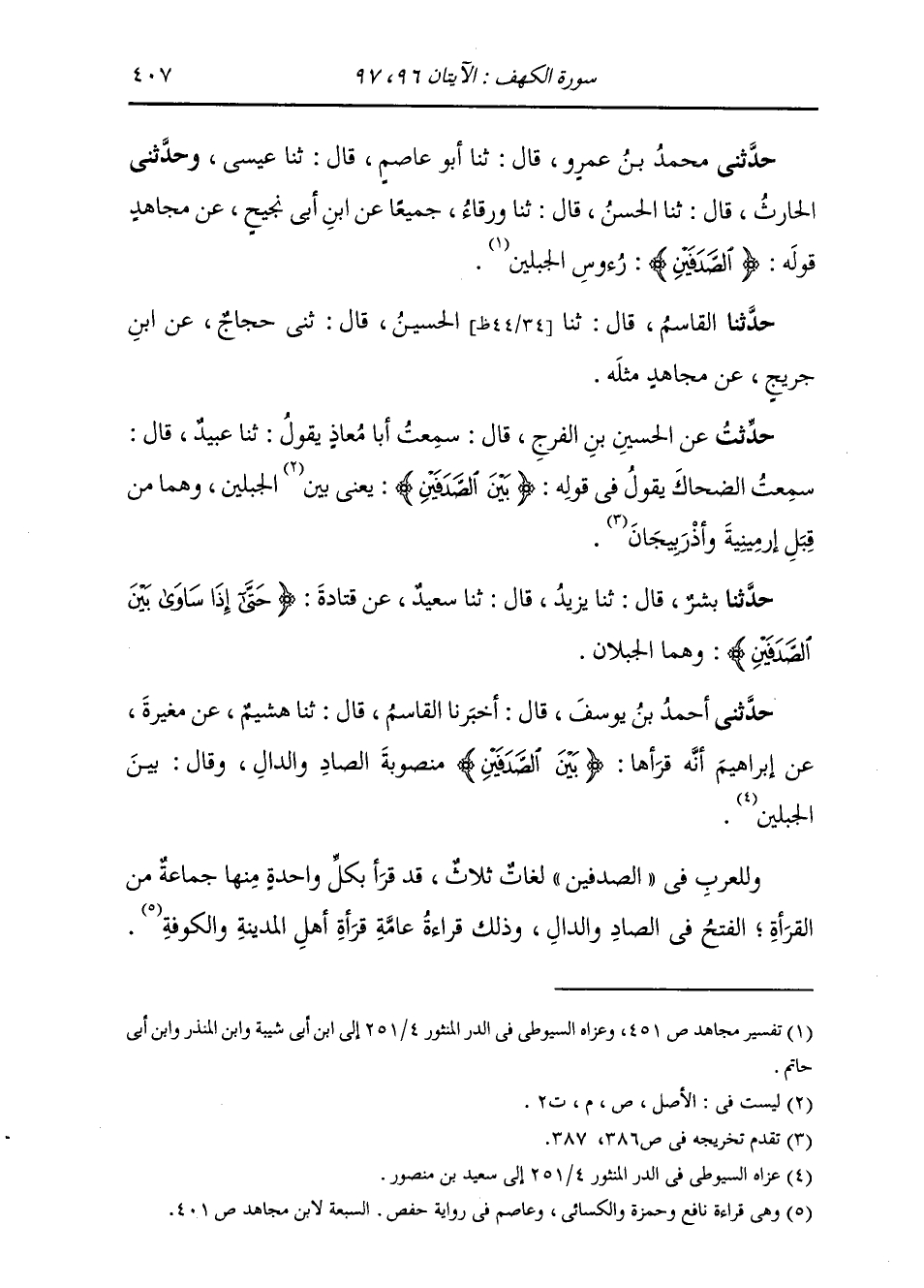 حَدَّثَنِي مُحَمَّدُ بْنُ عَمْرٍو، قَالَ: ثنا أَبُو عَاصِمٍ، قَالَ: ثنا عِيسَى، ح، وَحَدَّثَنِي الْحَارِثُ، قَالَ: ثنا الْحَسَنُ، قَالَ: ثنا وَرْقَاءُ، جَمِيعًا عَنِ ابْنِ أَبِي نَجِيحٍ، عَنْ مُجَاهِدٍ، قَوْلُهُ: {§الصَّدَفَيْنِ} [الكهف: 96] رُءُوسُ الْجَبَلَيْنِ حَدَّثَنَا الْقَاسِمُ، قَالَ: ثنا الْحُسَيْنُ، قَالَ: ثني حَجَّاجٌ، عَنِ ابْنِ جُرَيْجٍ، عَنْ مُجَاهِدٍ، مِثْلَهُ