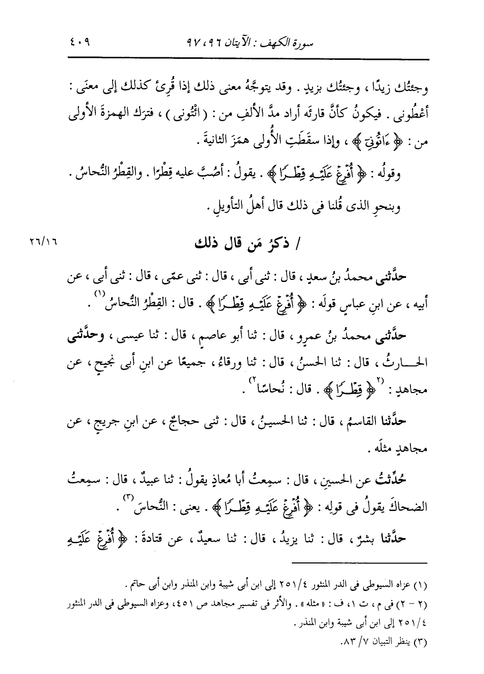 ذِكْرُ مَنْ قَالَ ذَلِكَ: حَدَّثَنِي مُحَمَّدُ بْنُ سَعْدٍ، قَالَ ثني أَبِي، قَالَ: ثني عَمِّي، قَالَ ثني أَبِي، عَنْ أَبِيهِ، عَنِ ابْنِ عَبَّاسٍ، قَوْلُهُ {§أُفْرِغْ عَلَيْهِ قِطْرًا} [الكهف: 96] قَالَ: الْقِطْرُ: النُّحَاسُ حَدَّثَنِي مُحَمَّدُ بْنُ عَمْرٍو، قَالَ: ثنا أَبُو عَاصِمٍ، قَالَ: ثنا عِيسَى، وَحَدَّثَنِي الْحَارِثُ، قَالَ: ثنا الْحَسَنُ، قَالَ: ثنا وَرْقَاءُ، جَمِيعًا عَنِ ابْنِ أَبِي نَجِيحٍ، عَنْ مُجَاهِدٍ، مِثْلَهُ حَدَّثَنَا الْقَاسِمُ، قَالَ: ثنا الْحُسَيْنُ، قَالَ: ثني حَجَّاجٌ، عَنِ ابْنِ جُرَيْجٍ، عَنْ مُجَاهِدٍ، مِثْلَهُ