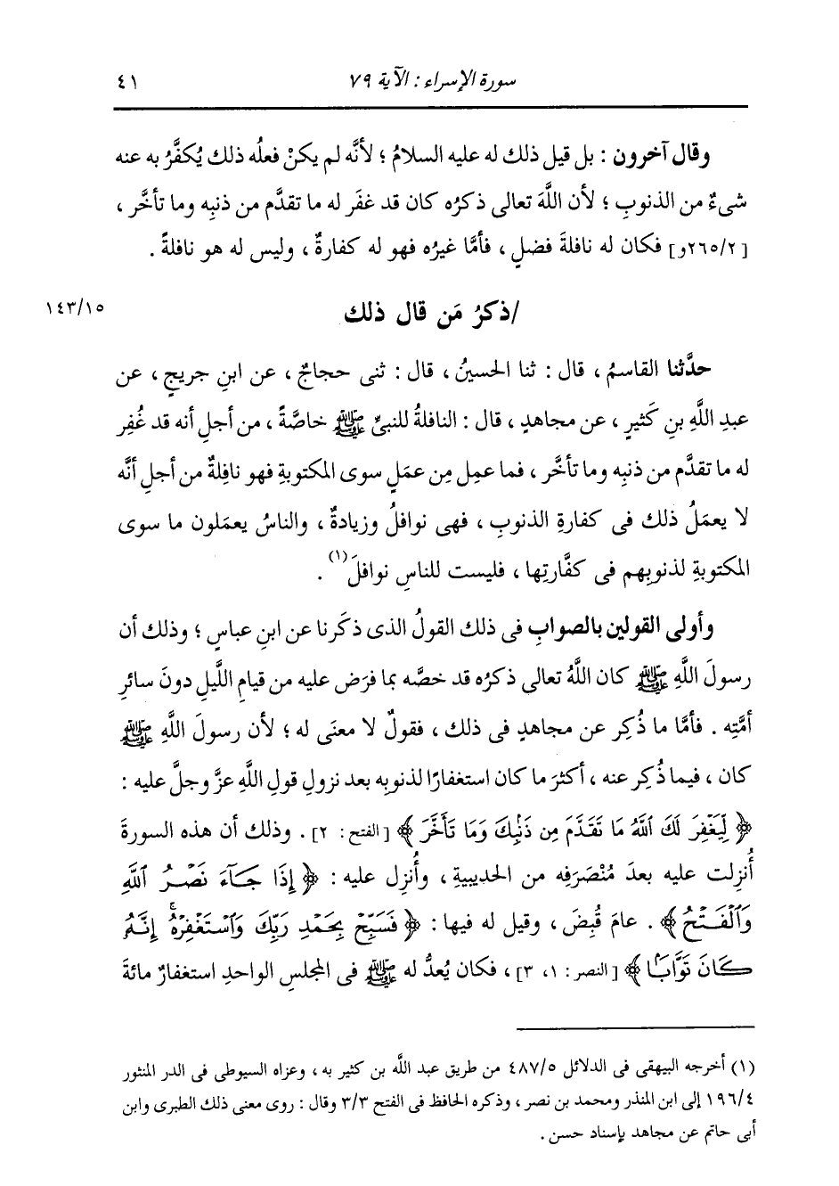 ذِكْرُ مَنْ قَالَ ذَلِكَ: حَدَّثَنَا الْقَاسِمُ، قَالَ: ثنا الْحُسَيْنُ، قَالَ: ثني حَجَّاجٌ، عَنِ ابْنِ جُرَيْجٍ، عَنْ عَبْدِ اللَّهِ بْنِ كَثِيرٍ، عَنْ مُجَاهِدٍ، قَالَ: §النَّافِلَةُ لِلنَّبِيِّ صَلَّى اللهُ عَلَيْهِ وَسَلَّمَ خَاصَّةً مِنْ أَجْلِ أَنَّهُ قَدْ غُفِرَ لَهُ مَا تَقَدَّمَ مِنْ ذَنْبِهِ وَمَا تَأَخَّرَ، فَمَا عَمِلَ مِنْ عَمَلٍ سِوَى الْمَكْتُوبَةِ، فَهُوَ نَافِلَةٌ مِنْ أَجْلِ أَنَّهُ لَا يَعْمَلُ ذَلِكَ فِي كَفَّارَةِ الذُّنُوبِ، فَهِيَ نَوَافِلُ وَزِيَادَةٌ، وَالنَّاسُ يَعْمَلُونَ مَا سِوَى الْمَكْتُوبَةِ لِذُنُوبِهِمْ فِي كَفَّارَتُهَا، فَلَيْسَتْ لِلنَّاسِ نَوَافِلُ وَأَوْلَى الْقَوْلَيْنِ بِالصَّوَابِ فِي ذَلِكَ، الْقَوْلُ الَّذِي ذَكَرْنَا عَنِ ابْنِ عَبَّاسٍ، وَذَلِكَ أَنَّ رَسُولَ اللَّهِ صَلَّى اللهُ عَلَيْهِ وَسَلَّمَ كَانَ اللَّهُ تَعَالَى قَدْ خَصَّهُ بِمَا فَرَضَ عَلَيْهِ مِنْ قِيَامِ اللَّيْلِ، دُونَ سَائِرِ أُمَّتِهِ. فَأَمَّا مَا ذُكِرَ عَنْ مُجَاهِدٍ فِي ذَلِكَ، فَقَوْلٌ لَا مَعْنًى لَهُ، لِأَنَّ رَسُولَ اللَّهِ صَلَّى اللهُ عَلَيْهِ وَسَلَّمَ فِيمَا ذُكِرَ عَنْهُ أَكْثَرُ مَا كَانَ اسْتِغْفَارًا لِذُنُوبِهِ بَعْدَ نُزُولِ قَوْلِ اللَّهِ عَزَّ وَجَلَّ عَلَيْهِ {لِيَغْفِرَ لَكَ اللَّهُ مَا تَقَدَّمَ مِنْ ذَنْبِكَ وَمَا تَأَخَّرَ} [الفتح: 2] وَذَلِكَ أَنَّ هَذِهِ السُّورَةَ أُنْزِلَتْ عَلَيْهِ بَعْدَ مُنْصَرَفِهِ مِنَ الْحُدَيْبِيَةِ، وَأُنْزِلَ عَلَيْهِ {إِذَا جَاءَ نَصْرُ اللَّهِ وَالْفَتْحُ} [النصر: 1] عَامَ قُبِضَ. وَقِيلَ لَهُ فِيهَا {فَسَبِّحْ بِحَمْدِ رَبِّكَ وَاسْتَغْفِرْهُ إِنَّهُ كَانَ تَوَّابًا} [النصر: 3] فَكَانَ يُعَدُّ لَهُ صَلَّى اللهُ عَلَيْهِ وَسَلَّمَ فِي الْمَجْلِسِ الْوَاحِدِ اسْتِغْفَارَ مِائَةِ -[42]- مَرَّةٍ وَمَعْلُومٌ أَنَّ اللَّهَ لَمْ يَأْمُرْهُ أَنْ يَسْتَغْفِرَ إِلَّا لِمَا يُغْفَرُ لَهُ بِاسْتِغْفَارِهِ ذَلِكَ، فَبَيِّنٌ إِذَنْ وَجْهُ فَسَادِ مَا قَالَهُ مُجَاهِدٌ