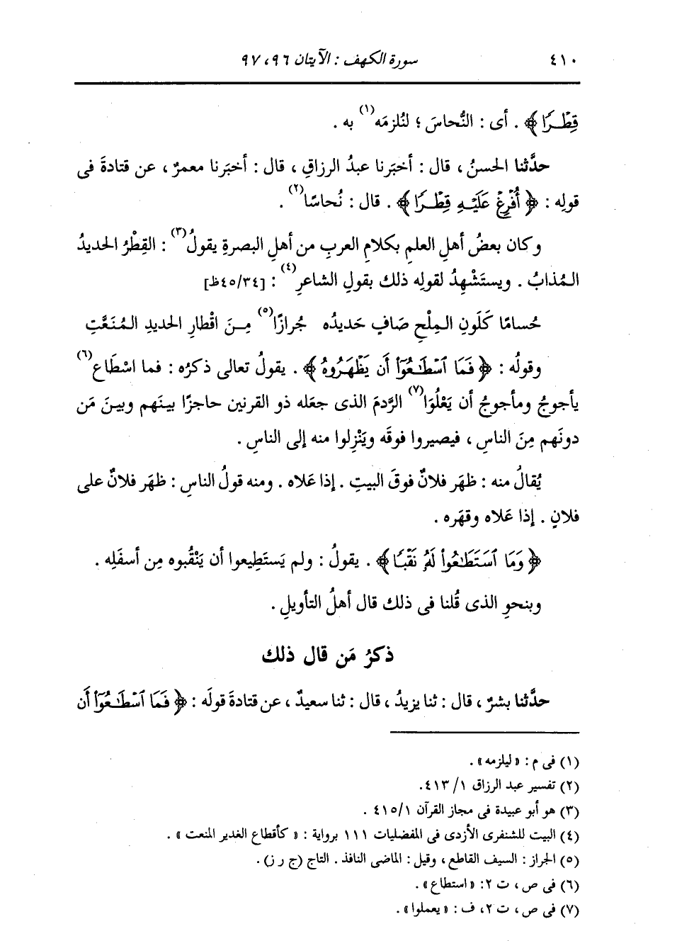 ذِكْرُ مَنْ قَالَ ذَلِكَ: حَدَّثَنَا بِشْرٌ، قَالَ: ثنا يَزِيدُ، قَالَ: ثنا سَعِيدٌ، عَنْ قَتَادَةَ، قَوْلُهُ: {§فَمَا اسْطَاعُوا أَنْ -[411]- يَظْهَرُوهُ} [الكهف: 97] مِنْ قَوْلِهِ: {وَمَا اسْتَطَاعُوا لهُ نَقْبًا} [الكهف: 97] أَيْ مِنْ أَسْفَلِهِ