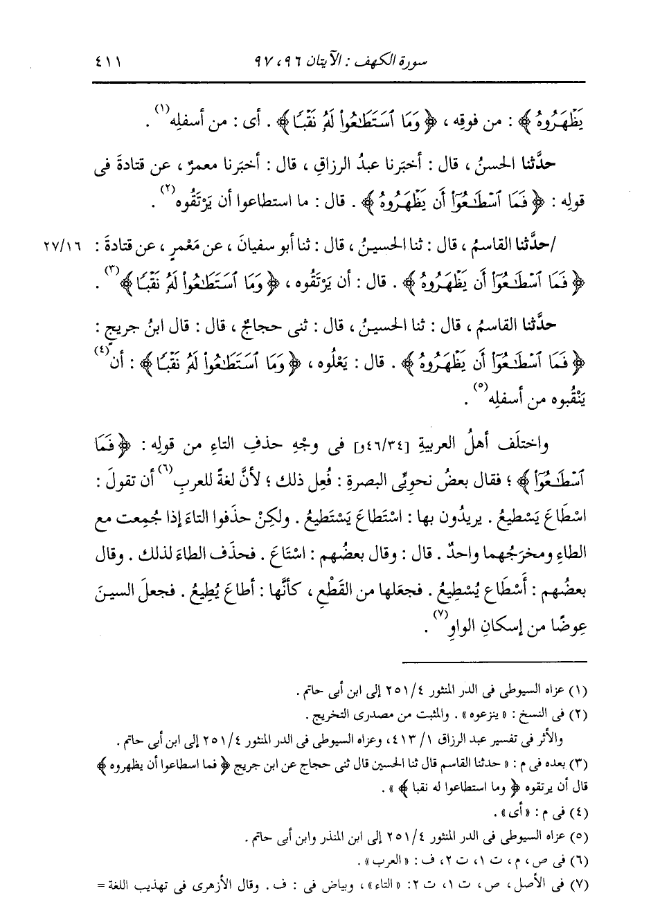 حَدَّثَنَا الْقَاسِمُ، قَالَ: ثنا الْحُسَيْنُ، قَالَ: ثني حَجَّاجٌ، عَنِ ابْنِ جُرَيْجٍ {§فَمَا اسْتَطَاعُوا أَنْ يَظْهَرُوهُ} قَالَ: يَعْلُوهُ {وَمَا اسْتَطَاعُوا لَهُ نَقْبًا} [الكهف: 97] أَيْ يَنْقُبُوهُ مِنْ أَسْفَلِهِ وَاخْتَلَفَ أَهْلُ الْعَرَبِيَّةِ فِي وَجْهِ حَذْفِ التَّاءِ مِنْ قَوْلِهِ: {فَمَا اسْطَاعُوا} [الكهف: 97] فَقَالَ بَعْضُ نَحْوِيِّي الْبَصْرَةِ: فَعَلَ ذَلِكَ لِأَنَّ لُغَةَ الْعَرَبِ أَنْ تَقُولَ: أَسْطَاعَ يَسْطِيعُ، يُرِيدُونَ بِهَا: اسْتَطَاعَ يَسْتَطِيعُ، وَلَكِنْ حَذَفُوا التَّاءَ إِذَا جُمِعَتْ مَعَ الطَّاءِ وَمَخْرَجُهُمَا وَاحِدٌ. قَالَ: وَقَالَ بَعْضُهُمُ: اسْتَاعَ، فَحَذَفَ الطَّاءَ لِذَلِكَ. وَقَالَ بَعْضُهُمْ: أَسْطَاعَ يُسْطِيعُ، فَجَعَلَهَا مِنَ الْقَطْعِ كَأَنَّهَا أَطَاعَ يُطِيعُ، فَجَعَلَ السِّينَ عِوَضًا مِنْ إِسْكَانِ الْوَاوِ. -[412]- وَقَالَ بَعْضُ نَحْوِيِّي الْكُوفَةِ: هَذَا حَرْفٌ اسْتُعْمِلَ فَكَثُرَ حَتَّى حُذِفَ