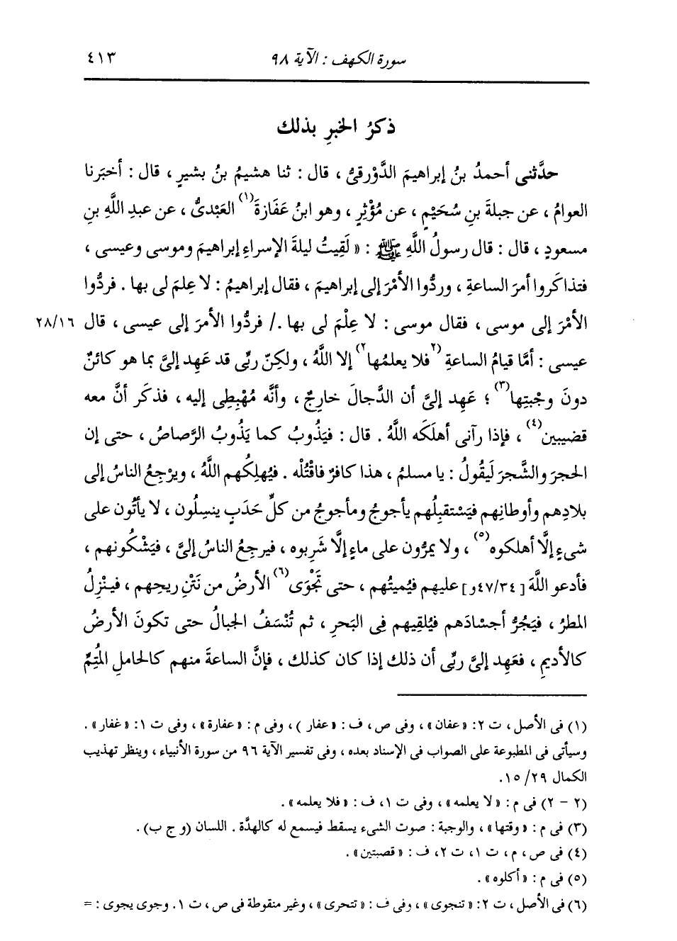 ذِكْرُ الْخَبَرِ بِذَلِكَ: حَدَّثَنِي أَحْمَدُ بْنُ إِبْرَاهِيمَ الدَّوْرَقِيُّ، قَالَ: ثنا هُشَيْمُ بْنُ بَشِيرٍ، قَالَ: أَخْبَرَنَا الْعَوَّامُ، عَنْ جَبَلَةَ بْنِ سُحَيْمٍ، عَنْ مُؤْثِرٍ وَهُوَ ابْنُ عَفَازَةَ الْعَبْدِيُّ، عَنْ عَبْدِ اللَّهِ بْنِ مَسْعُودٍ، قَالَ: قَالَ رَسُولُ اللَّهِ صَلَّى اللهُ عَلَيْهِ وَسَلَّمَ: " §لَقِيتُ لَيْلَةَ الْإِسْرَاءِ إِبْرَاهِيمَ وَمُوسَى وَعِيسَى فَتَذَاكَرُوا أَمْرَ السَّاعَةِ، وَرَدُّوا الْأَمْرَ إِلَى إِبْرَاهِيمَ فَقَالَ إِبْرَاهِيمُ: لَا عِلْمَ لِي بِهَا، فَرَدُّوا الْأَمْرَ إِلَى مُوسَى، فَقَالَ مُوسَى: لَا عِلْمَ لِي بِهَا، فَرَدُّوا الْأَمْرَ إِلَى عِيسَى، قَالَ عِيسَى: أَمَّا قِيَامُ السَّاعَةِ لَا يَعْلَمُهُ إِلَّا اللَّهُ، وَلَكِنْ رَبِّي قَدْ عَهِدَ إِلَيَّ بِمَا هُوَ كَائِنٌ دُونَ وَقْتِهَا، عَهِدَ إِلَيَّ أَنَّ الدَّجَّالَ خَارِجٌ، وَأَنَّهُ مُهْبِطِي إِلَيْهِ، فَذَكَرَ أَنَّ مَعَهَ قَصَبَتَيْنِ، فَإِذَا رَآنِي أَهْلَكَهُ اللَّهُ، قَالَ: فَيَذُوبُ كَمَا يَذُوبُ الرَّصَاصُ، حَتَّى إِنَّ الْحَجَرَ وَالشَّجَرَ لَيَقُولُ: يَا مُسْلِمُ هَذَا كَافِرٌ فَاقْتُلْهُ، فَيُهْلِكُهُمُ اللَّهُ، وَيَرْجِعُ النَّاسُ إِلَى بِلَادِهِمْ وَأَوْطَانِهِمْ فَيَسْتَقْبِلُهُمْ يَأْجُوجُ وَمَأْجُوجُ مِنْ كُلِّ حَدَبٍ يَنْسِلُونَ، لَا يَأْتُونَ عَلَى شَيْءٍ إِلَّا أَكَلُوهُ، وَلَا يَمُرُّونَ عَلَى مَاءٍ إِلَّا شَرِبُوهُ، فَيَرْجِعُ النَّاسُ إِلَيَّ، فَيَشْكُونَهُمْ، فَأَدْعُو اللَّهَ عَلَيْهِمْ فَيُمِيتُهُمْ حَتَّى تَجْوَى الْأَرْضُ مِنْ نَتْنِ رِيحِهِمْ، فَيَنْزِلُ الْمَطَرُ، فَيَجُرُّ أَجْسَادَهُمْ، فَيُلْقِيهِمْ فِي الْبَحْرِ، ثُمَّ يَنْسِفُ الْجِبَالَ حَتَّى تَكُونَ الْأَرْضُ كَالْأَدِيمِ، فَعَهِدَ إِلَيَّ رَبِّي أَنَّ ذَلِكَ إِذَا كَانَ كَذَلِكَ، فَإِنَّ السَّاعَةَ مِنْهُمْ كَالْحَامِلِ الْمُتِمِّ -[414]- الَّتِي لَا يَدْرِي أَهْلُهَا مَتَى تَفْجَؤُهُمْ بِوِلَادِهَا، لَيْلًا أَوْ نَهَارًا "