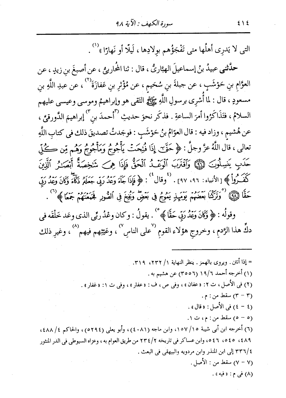 حَدَّثَنِي عُبَيْدُ بْنُ إِسْمَاعِيلَ، قَالَ: ثنا الْمُحَارِبِيُّ، عَنْ أُصْبُعِ بْنِ زَيْدٍ، عَنِ الْعَوَّامِ بْنِ حَوْشَبٍ، عَنْ جَبَلَةَ بْنِ سُحَيْمٍ، عَنْ مُؤْثِرِ بْنِ عَفَازَةَ، عَنْ عَبْدِ اللَّهِ بْنِ مَسْعُودٍ، قَالَ: لَمَّا أُسْرِيَ بِرَسُولِ اللَّهِ صَلَّى اللهُ عَلَيْهِ وَسَلَّمَ الْتَقَى هُوَ وَإِبْرَاهِيمُ وَمُوسَى وَعِيسَى عَلَيْهِمُ السَّلَامُ، فَتَذَاكَرُوا أَمْرَ السَّاعَةِ. فَذَكَرَ نَحْوَ حَدِيثِ إِبْرَاهِيمَ الدَّوْرَقِيِّ عَنْ هُشَيْمٍ، وَزَادَ فِيهِ: قَالَ الْعَوَّامُ بْنُ حَوْشَبٍ: فَوَجَدْتُ تَصْدِيقَ ذَلِكَ فِي كِتَابِ اللَّهِ تَعَالَى، قَالَ اللَّهُ عَزَّ وَجَلَّ: {§حَتَّى إِذَا فُتِحَتْ يَأْجُوجُ وَمَأْجُوجُ وَهُمْ مِنْ كُلِّ حَدَبٍ يَنْسِلُونَ وَاقْتَرَبَ الْوَعْدُ الْحَقُّ فَإِذَا هِيَ شَاخِصَةٌ أَبْصَارُ الَّذِينَ كَفَرُوا} [الأنبياء: 97] ، وَقَالَ: {فَإِذَا جَاءَ وَعْدُ رَبِّي جَعَلَهُ دَكَّاءَ وَكَانَ وَعْدُ رَبِّي حَقًّا} [الكهف: 98] يَقُولُ: وَكَانَ وَعْدُ رَبِّي الَّذِي وَعَدَ خَلْقَهُ فِي دَكِّ هَذَا الرَّدْمِ، وَخُرُوجِ هَؤُلَاءِ الْقَوْمِ عَلَى النَّاسِ، وَعَيْثِهِمْ فِيهِ، وَغَيْرِ ذَلِكَ -[415]- مِنْ وَعْدِهِ حَقًّا، لِأَنَّهُ لَا يَخْلُفُ الْمِيعَادَ فَلَا يَقَعُ غَيْرَ مَا وَعَدَ أَنَّهُ كَائِنٌ