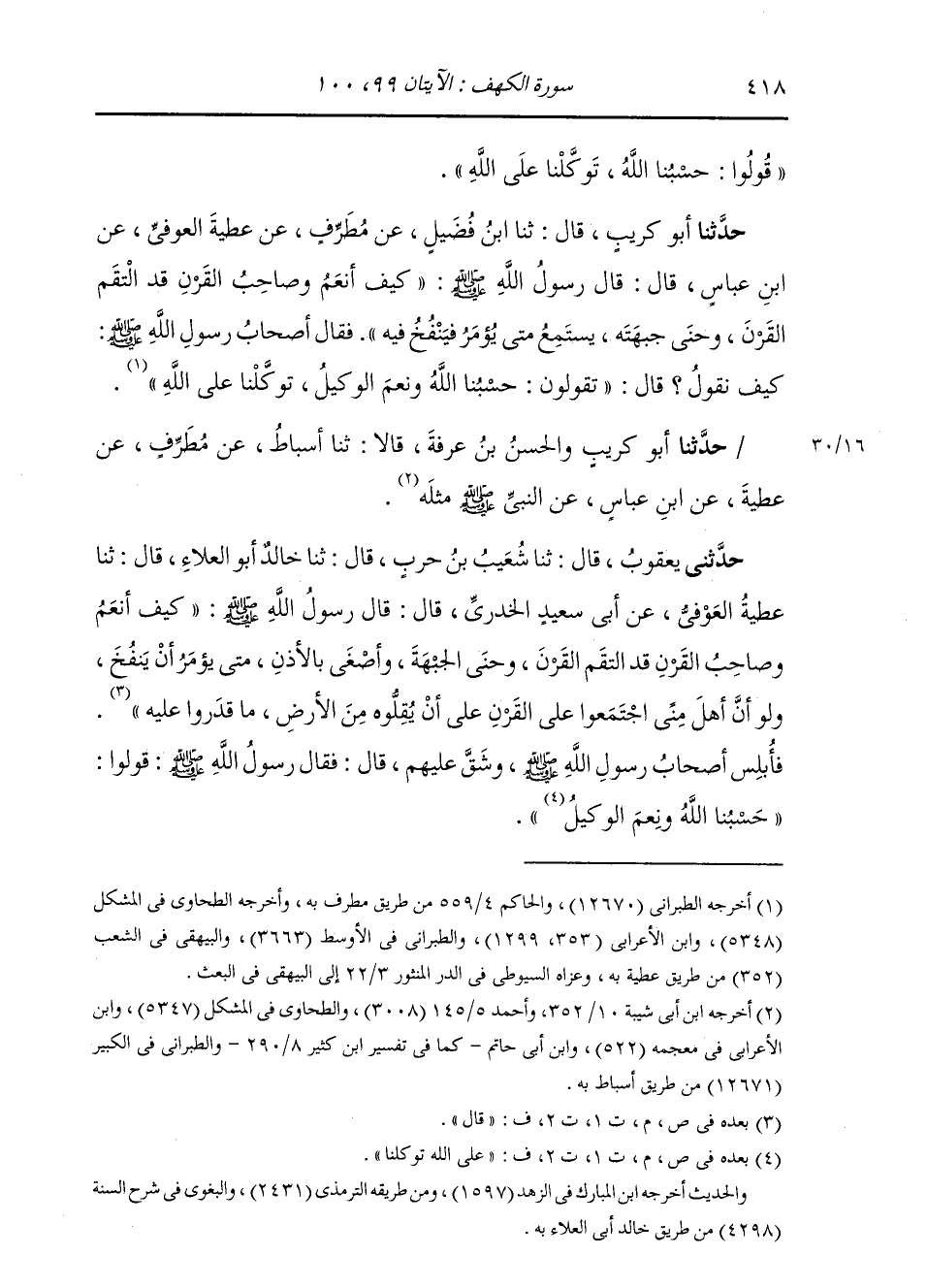 حَدَّثَنَا أَبُو كُرَيْبٍ، قَالَ: ثنا ابْنُ فُضَيْلٍ، عَنْ مُطَرِّفٍ، عَنْ عَطِيَّةَ، عَنِ ابْنِ عَبَّاسٍ، قَالَ: قَالَ رَسُولُ اللَّهِ صَلَّى اللهُ عَلَيْهِ وَسَلَّمَ: «§كَيْفَ أَنْعَمُ وَصَاحِبُ الْقَرْنِ قَدِ الْتَقَمَ الْقَرْنَ، وَحَنَى جَبْهَتَهُ يَسْتَمِعُ مَتَى يُؤْمَرُ بِنَفْخٍ فِيهِ» فَقَالَ أَصْحَابُ رَسُولِ اللَّهِ صَلَّى اللهُ عَلَيْهِ وَسَلَّمَ: فَكَيْفَ نَقُولُ؟ قَالَ: " تَقُولُونَ: حَسْبُنَا اللَّهُ وَنِعْمَ الْوَكِيلُ، تَوَكَّلْنَا عَلَى اللَّهِ " حَدَّثَنَا أَبُو كُرَيْبٍ وَالْحَسَنُ بْنُ عَرَفَةَ، قَالَا: ثنا أَسْبَاطٌ، عَنْ مُطَرِّفٍ، عَنْ عَطِيَّةَ، عَنِ ابْنِ عَبَّاسٍ، عَنِ النَّبِيِّ صَلَّى اللهُ عَلَيْهِ وَسَلَّمَ، مِثْلَهُ