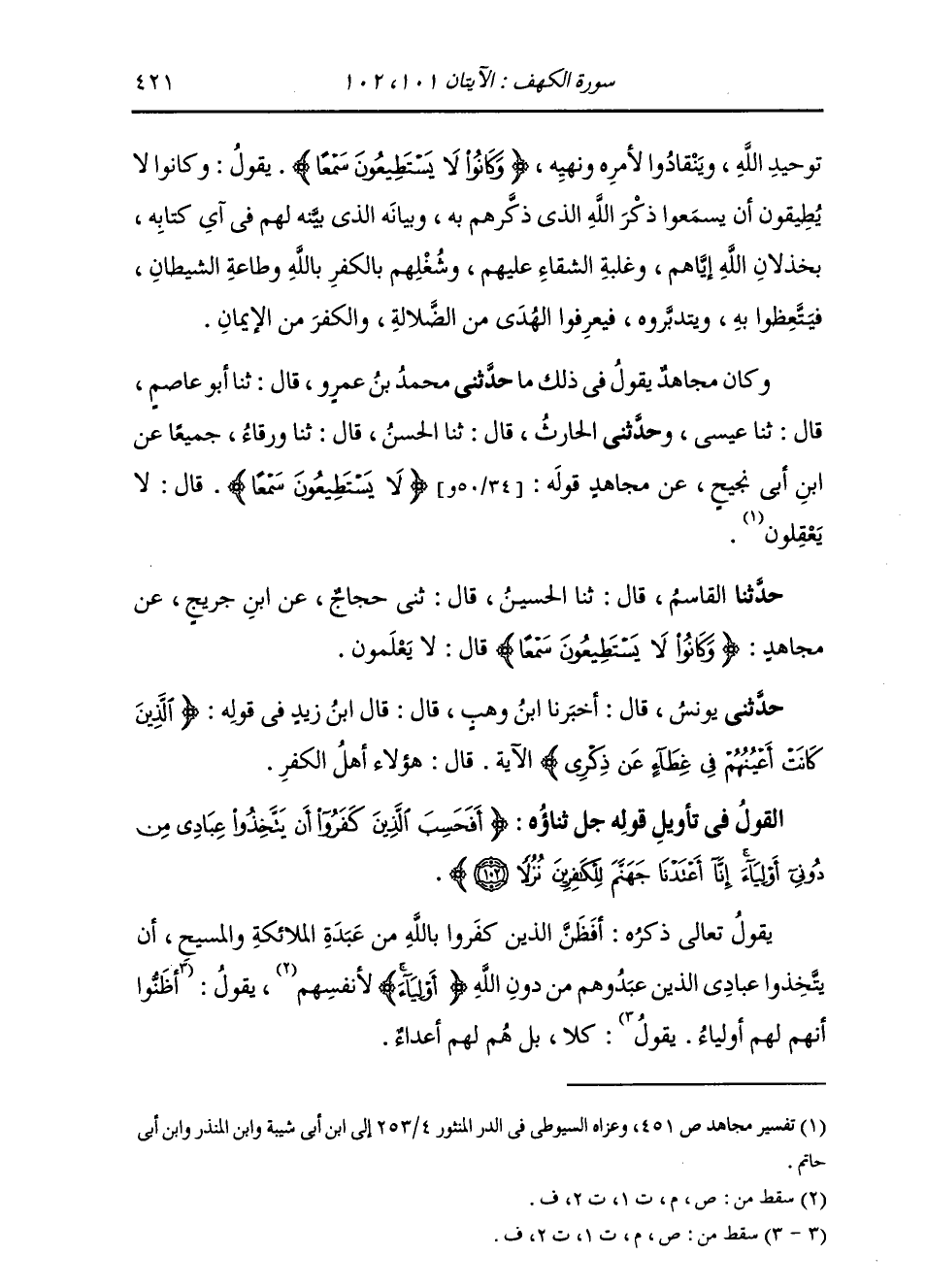 حَدَّثَنِي مُحَمَّدُ بْنُ عَمْرٍو، قَالَا: ثنا أَبُو عَاصِمٍ، قَالَ: ثنا عِيسَى، وَحَدَّثَنِي الْحَارِثُ، قَالَ: ثنا الْحَسَنُ، قَالَ: ثنا وَرْقَاءُ، جَمِيعًا عَنِ ابْنِ أَبِي نَجِيحٍ، عَنْ مُجَاهِدٍ، قَوْلُهُ: {§لَا يَسْتَطِيعُونَ سَمْعًا} [الكهف: 101] قَالَ: لَا يَعْقِلُونَ