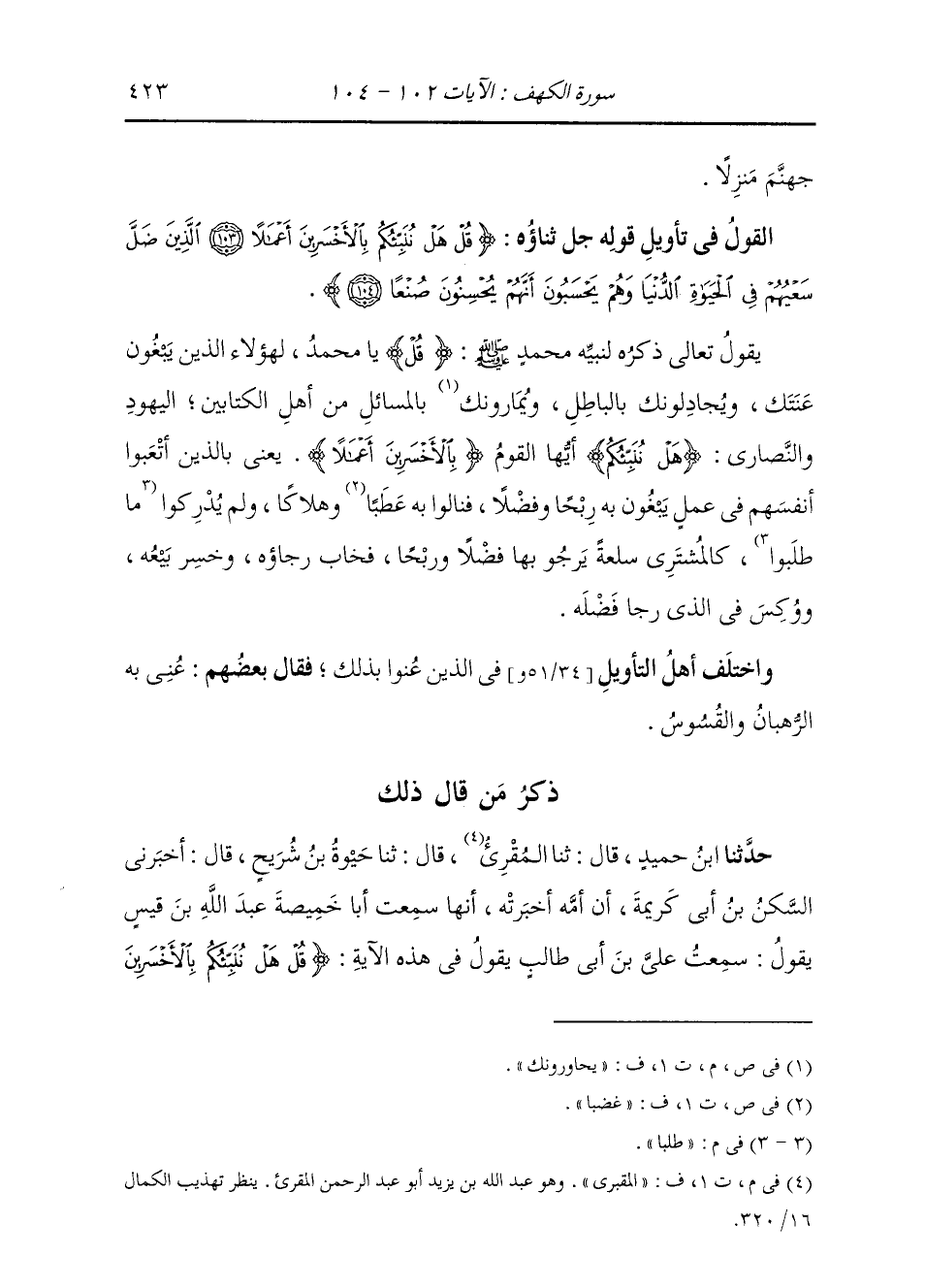 §الْقَوْلُ فِي تَأْوِيلِ قَوْلِهِ تَعَالَى: {قُلْ هَلْ نُنَبِّئُكُمْ بِالْأَخْسَرِينَ أَعْمَالًا الَّذِينَ ضَلَّ سَعْيُهُمْ فِي الْحَيَاةِ الدُّنْيَا وَهُمْ يَحْسَبُونَ أَنَّهُمْ يُحْسِنُونَ صُنْعًا} [الكهف: 104] يَقُولُ تَعَالَى ذِكْرُهُ لِنَبِيِّهِ مُحَمَّدٍ صَلَّى اللهُ عَلَيْهِ وَسَلَّمَ: {قُلْ} [البقرة: 80] يَا مُحَمَّدُ لِهَؤُلَاءِ الَّذِينَ يَبْغُونَ عَنَتَكَ وَيُجَادِلُونَكَ بِالْبَاطِلِ، وَيُحَاوِرُونَكَ بِالْمَسَائِلِ مِنْ أَهْلِ الْكِتَابَيْنِ: الْيَهُودُ، وَالنَّصَارَى {هَلْ نُنَبِّئُكُمْ} [الكهف: 103] أَيُّهَا الْقَوْمُ {بِالْأَخْسَرِينَ أَعْمَالًا} [الكهف: 103] يَعْنِي بِالَّذِينَ أَتْعَبُوا أَنْفُسَهُمْ فِي عَمَلٍ يَبْغُونَ بِهِ رِبْحًا وَفَضْلًا، فَنَالُوا بِهِ عَطَبًا وَهَلَاكًا وَلَمْ يُدْرِكُوا طَلَبًا، كَالْمُشْتَرِي سِلْعَةً يَرْجُو بِهَا فَضْلًا وَرِبْحًا، فَخَابَ رَجَاؤُهُ وَخَسِرَ بَيْعُهُ، وَوُكِسَ فِي الَّذِي رَجَا فَضْلَهُ. وَاخْتَلَفَ أَهْلُ التَّأْوِيلِ فِي الَّذِينَ عُنُوا بِذَلِكَ، فَقَالَ بَعْضُهُمْ: عُنِيَ بِهِ الرُّهْبَانُ وَالْقُسُوسُ