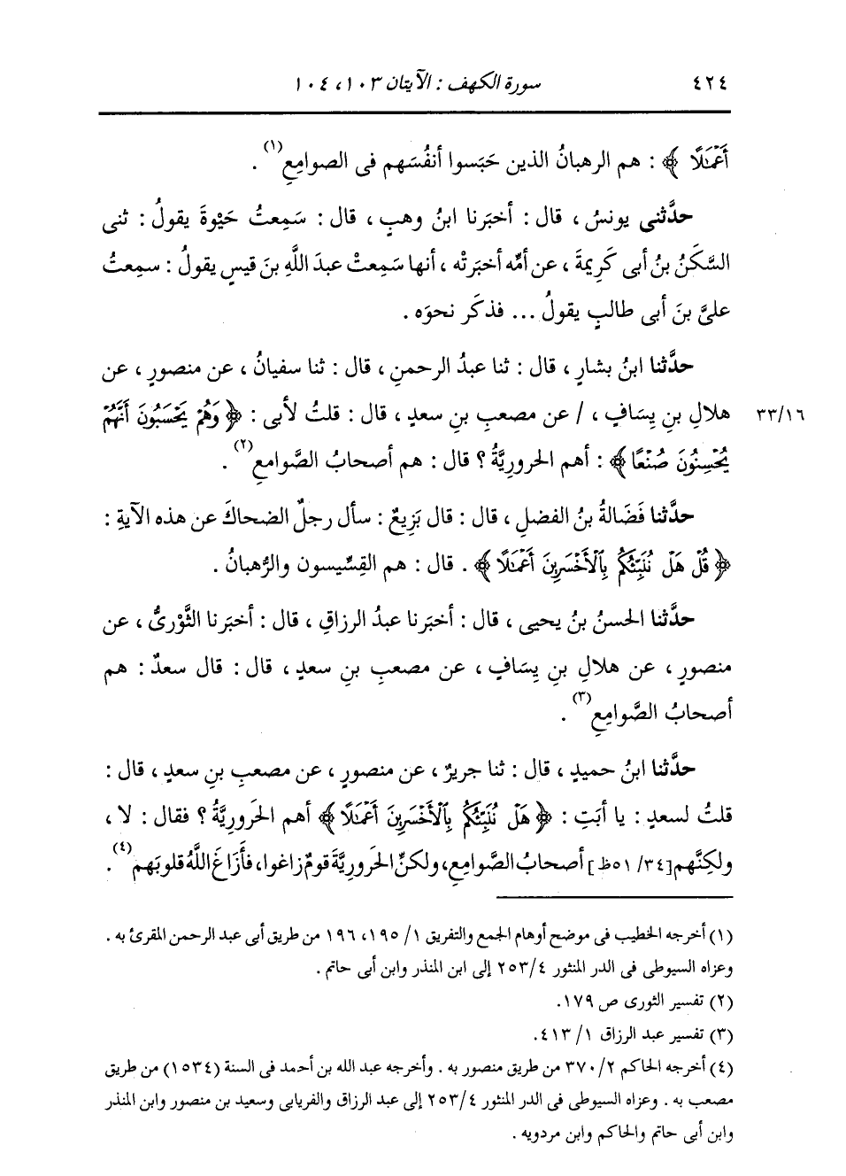 حَدَّثَنَا ابْنُ بَشَّارٍ، قَالَ: ثنا عَبْدُ الرَّحْمَنِ، قَالَ: ثنا سُفْيَانُ، عَنْ مَنْصُورٍ، عَنْ هِلَالِ بْنِ يَسَافٍ، عَنْ مُصْعَبِ بْنِ سَعْدٍ، قَالَ: قُلْتُ لِأَبِي: {§وَهُمْ يَحْسِبُونَ أَنَّهُمْ يُحْسِنُونَ صُنْعًا} [الكهف: 104] أَهُمُ الْحَرُورِيَّةُ؟ قَالَ: هُمْ أَصْحَابُ الصَّوَامِعِ