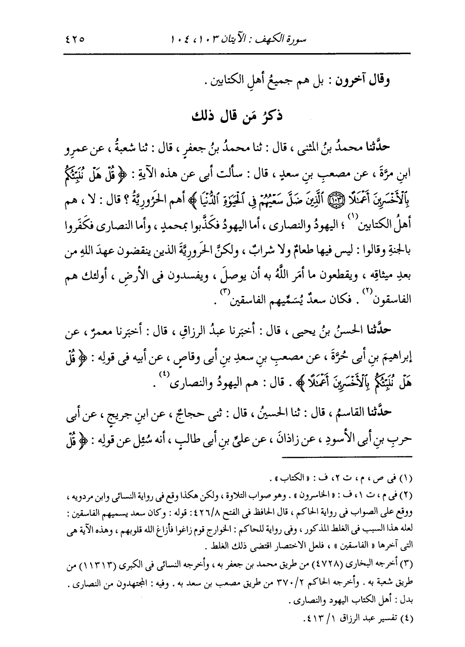 ذِكْرُ مَنْ قَالَ ذَلِكَ: حَدَّثَنَا مُحَمَّدُ بْنُ الْمُثَنَّى، قَالَ: ثنا مُحَمَّدُ بْنُ جَعْفَرٍ، قَالَ ثنا شُعْبَةُ، عَنْ عَمْرِو بْنِ مُرَّةَ، عَنْ مُصْعَبِ بْنِ سَعْدٍ، قَالَ: §سَأَلْتُ أَبِي عَنْ هَذِهِ الْآيَةِ، {قُلْ هَلْ نُنَبِّئُكُمْ بِالْأَخْسَرِينَ أَعْمَالًا الَّذِينَ ضَلَّ سَعْيُهُمْ فِي الْحَيَاةِ الدُّنْيَا} [الكهف: 104] أَهُمُ الْحَرُورِيَّةُ؟ قَالَ: لَا، هُمْ أَهْلُ الْكِتَابِ، الْيَهُودُ وَالنَّصَارَى. أَمَّا الْيَهُودُ فَكَذَّبُوا بِمُحَمَّدٍ، وَأَمَّا النَّصَارَى فَكَفَرُوا بِالْجَنَّةِ، قَالُوا: لَيْسَ فِيهَا طَعَامُ وَلَا شَرَابُ، وَلَكِنَّ الْحَرُورِيَّةَ {الَّذِينَ يَنْقُضُونَ عَهْدَ اللَّهِ مِنْ بَعْدِ مِيثَاقِهِ وَيَقْطَعُونَ مَا أَمَرَ اللَّهُ بِهِ أَنْ يُوصَلَ وَيُفْسِدُونَ فِي الْأَرْضِ أُولَئِكَ هُمُ الْخَاسِرُونَ} [البقرة: 27] فَكَانَ سَعْدٌ يُسَمِّيهِمُ الْفَاسِقِينَ