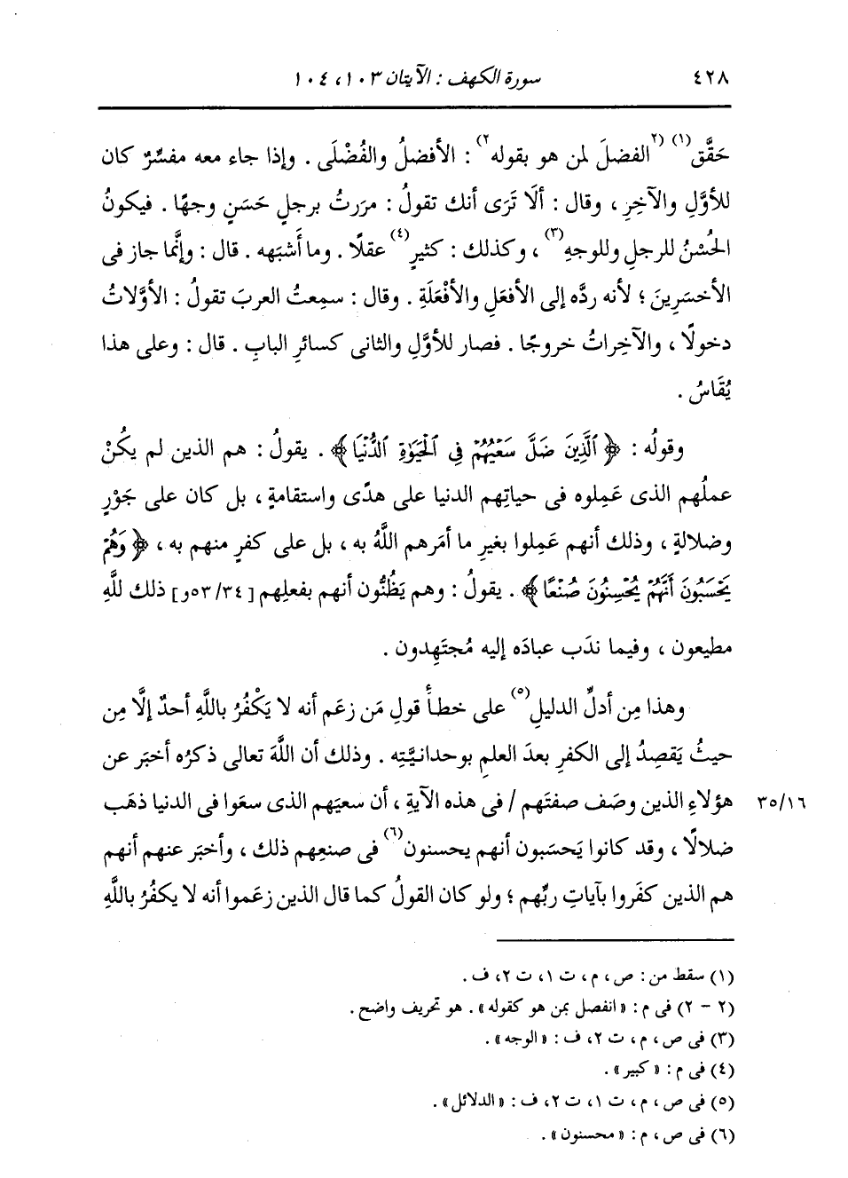 §وَقَوْلُهُ: {الَّذِينَ ضَلَّ سَعْيُهُمْ فِي الْحَيَاةِ الدُّنْيَا} [الكهف: 104] يَقُولُ: هُمُ الَّذِينَ لَمْ يَكُنْ عَمَلُهُمُ الَّذِي عَمِلُوهُ فِي حَيَاتِهِمُ الدُّنْيَا عَلَى هُدًى وَاسْتِقَامَةٍ، بَلْ كَانَ عَلَى جَوْرٍ وَضَلَالَةٍ، وَذَلِكَ أَنَّهُمْ عَمِلُوا بِغَيْرِ مَا أَمَرَهُمُ اللَّهُ بِهِ بَلْ عَلَى كُفْرٍ مِنْهُمْ بِهِ {وَهُمْ يَحْسِبُونَ أَنَّهُمْ يُحْسِنُونَ صُنْعًا} [الكهف: 104] يَقُولُ: وَهُمْ يَظُنُّونَ أَنَّهُمْ بِفِعْلِهِمْ ذَلِكَ لِلَّهِ مُطِيعُونَ، وَفِيمَا نَدَبَ عِبَادَهُ إِلَيْهِ مُجْتَهِدُونَ، وَهَذَا مِنْ أَدَلِّ الدَّلَائِلِ عَلَى خَطَأِ قَوْلِ مَنْ زَعَمَ أَنَّهُ لَا يَكْفُرُ بِاللَّهِ أَحَدٌ إِلَّا مِنْ حَيْثُ يَقْصِدُ إِلَى الْكُفْرِ بَعْدَ الْعِلْمِ بِوَحْدَانِيَّتِهِ، وَذَلِكَ أَنَّ اللَّهَ تَعَالَى ذِكْرُهُ أَخْبَرَ عَنْ هَؤُلَاءِ الَّذِينَ وَصَفَ صِفَتَهُمْ فِي هَذِهِ الْآيَةِ، أَنَّ سَعْيَهُمُ الَّذِي سَعَوْا فِي الدُّنْيَا ذَهَبَ ضَلَالًا، وَقَدْ كَانُوا يَحْسَبُونَ أَنَّهُمْ مُحْسِنُونَ فِي صُنْعِهِمْ ذَلِكَ، وَأَخْبَرَ عَنْهُمْ أَنَّهُمْ هُمُ الَّذِينَ كَفَرُوا بِآيَاتِ رَبِّهِمْ. وَلَوْ كَانَ الْقَوْلُ كَمَا قَالَ الَّذِينَ زَعَمُوا أَنَّهُ لَا يَكْفُرُ بِاللَّهِ