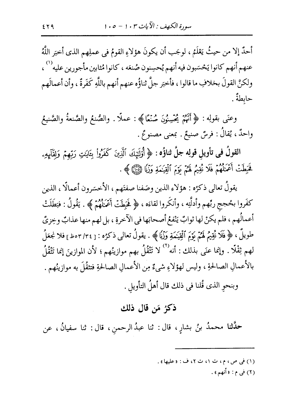 §الْقَوْلُ فِي تَأْوِيلِ قَوْلِهِ تَعَالَى: {أُولَئِكَ الَّذِينَ كَفَرُوا بِآيَاتِ رَبِّهِمْ وَلِقَائِهِ فَحَبِطَتْ أَعْمَالُهُمْ فَلَا نُقِيمُ لَهُمْ يَوْمَ الْقِيَامَةِ وَزْنًا} [الكهف: 105] يَقُولُ تَعَالَى ذِكْرُهُ: هَؤُلَاءِ الَّذِينَ وَصَفْنَا صِفَتَهُمُ، الْأَخْسَرُونَ أَعْمَالًا، الَّذِينَ كَفَرُوا بِحُجَجِ رَبِّهِمْ وَأَدِلَّتِهِ، وَأَنْكَرُوا لِقَاءَهُ {فَحَبِطَتْ أَعْمَالُهُمْ} [الكهف: 105] يَقُولُ: فَبَطَلَتْ أَعْمَالُهُمْ، فَلَمْ يَكُنْ لَهَا ثَوَابٌ يَنْفَعُ أَصْحَابَهَا فِي الْآخِرَةِ، بَلْ لَهُمْ مِنْهَا عَذَابٌ وَخِزْي طَوِيلٌ {فَلَا نُقِيمُ لَهُمْ يَوْمَ الْقِيَامَةِ وَزْنًا} [الكهف: 105] يَقُولُ تَعَالَى ذِكْرُهُ: فَلَا نَجْعَلُ لَهُمْ ثِقَلًا. وَإِنَّمَا عَنَى بِذَلِكَ: أَنَّهُمْ لَا تَثْقُلُ بِهِمْ مَوَازِينُهُمْ، لِأَنَّ الْمَوَازِينَ إِنَّمَا تَثْقُلُ بِالْأَعْمَالِ الصَّالِحَةِ، وَلَيْسَ لِهَؤُلَاءِ شَيْءٌ مِنَ الْأَعْمَالِ الصَّالِحَةِ فَتَثْقُلُ بِهِ مَوَازِينُهُمْ. وَبِنَحْوِ الَّذِي قُلْنَا فِي ذَلِكَ، قَالَ أَهْلُ التَّأْوِيلِ