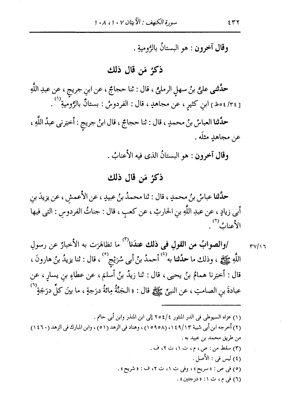 ذِكْرُ مَنْ قَالَ ذَلِكَ: حَدَّثَنِي عَلِيُّ بْنُ سَهْلٍ الرَّمْلِيُّ، قَالَ: ثنا حَجَّاجٌ، عَنِ ابْنِ جُرَيْجٍ، عَنْ عَبْدِ اللَّهِ بْنِ كَثِيرٍ، عَنْ مُجَاهِدٍ، قَالَ: §الْفِرْدَوْسُ: بُسْتَانٌ بِالرُّومِيَّةِ حَدَّثَنَا الْعَبَّاسُ بْنُ مُحَمَّدٍ، قَالَ: ثنا حَجَّاجٌ، قَالَ: ابْنُ جُرَيْجٍ: أَخْبَرَنِي عَبْدُ اللَّهِ، عَنْ مُجَاهِدٍ، مِثْلَهُ وَقَالَ آخَرُونَ: هُوَ الْبُسْتَانُ الَّذِي فِيهِ الْأَعْنَابُ