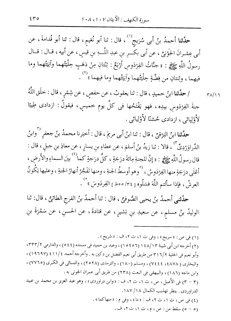 حَدَّثَنَا أَحْمَدُ بْنُ أَبِي سُرَيْجٍ، قَالَ: ثنا أَبُو نُعَيْمٍ، قَالَ: ثنا أَبُو قُدَامَةَ، عَنْ أَبِي عِمْرَانَ الْجَوْنِيِّ، عَنْ أَبِي بَكْرِ بْنِ عَبْدِ اللَّهِ بْنِ قَيْسٍ، عَنْ أَبِيهِ، قَالَ: قَالَ رَسُولُ اللَّهِ صَلَّى اللهُ عَلَيْهِ وَسَلَّمَ: " §جَنَّاتُ الْفِرْدَوْسِ أَرْبَعٌ: ثِنْتَانِ مِنْ ذَهَبٍ حِلْيَتُهُمَا وَآنِيَتُهُمَا وَمَا فِيهِمَا، وَثِنْتَانِ مِنْ فِضَّةٍ حِلْيَتُهُمَا وَآنِيَتُهُمَا وَمَا فِيهِمَا "