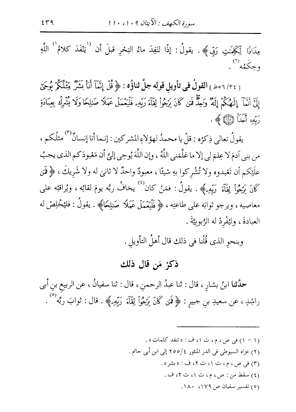§الْقَوْلُ فِي تَأْوِيلِ قَوْلِهِ تَعَالَى: {قُلْ إِنَّمَا أَنَا بَشَرٌ مِثْلُكُمْ يُوحَى إِلَيَّ أَنَّمَا إِلَهُكُمْ إِلَهٌ وَاحِدٌ فَمَنْ كَانَ يَرْجُو لِقَاءَ رَبِّهِ فَلْيَعْمَلْ عَمَلًا صَالِحًا وَلَا يُشْرِكْ بِعِبَادَةِ رَبِّهِ أَحَدًا} [الكهف: 110] يَقُولُ تَعَالَى ذِكْرُهُ: قُلْ لِهَؤُلَاءِ الْمُشْرِكِينَ يَا مُحَمَّدُ: إِنَّمَا أَنَا بَشَرٌ مِثْلُكُمْ مِنْ بَنِي آدَمَ لَا عِلْمَ لِي إِلَّا مَا عَلَّمَنِي اللَّهُ وَإِنَّ اللَّهَ يُوحِي إِلَيَّ أَنَّ مَعْبُودَكُمُ الَّذِي يَجِبُ عَلَيْكُمْ أَنْ تَعْبُدُوهُ وَلَا تُشْرِكُوا بِهِ شَيْئًا، مَعْبُودٌ وَاحِدٌ لَا ثَانِيَ لَهُ، وَلَا شَرِيكَ {فَمَنْ كَانَ يَرْجُو لِقَاءَ رَبِّهِ} [الكهف: 110] يَقُولُ: فَمَنْ يَخَافُ رَبَّهُ يَوْمَ لِقَائِهِ، وَيُرَاقِبُهُ عَلَى مَعَاصِيهِ، وَيَرْجُو ثَوَابَهُ عَلَى طَاعَتِهِ {فَلْيَعْمَلْ عَمَلًا صَالِحًا} [الكهف: 110] يَقُولُ: فَلْيُخْلِصْ لَهُ الْعِبَادَةَ، وَلْيُفْرِدْ لَهُ الرُّبُوبِيَّةَ. وَبِنَحْوِ الَّذِي قُلْنَا فِي ذَلِكَ قَالَ أَهْلُ التَّأْوِيلِ