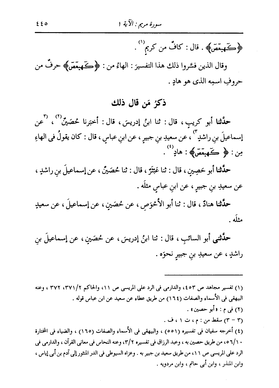 ذِكْرُ مَنْ قَالَ ذَلِكَ: حَدَّثَنَا أَبُو كُرَيْبٍ، قَالَ: ثنا ابْنُ إِدْرِيسَ، قَالَ: أَخْبَرَنَا أَبُو حُصَيْنٍ، عَنْ سَعِيدِ بْنِ جُبَيْرٍ، عَنِ ابْنِ عَبَّاسٍ، قَالَ: كَانَ يَقُولُ فِي الْهَاءِ مِنْ {§كهيعص} [مريم: 1] هَادٍ حَدَّثَنَا أَبُو حُصَيْنٍ، قَالَ: ثنا عَبْثَرٌ، قَالَ: ثنا حُصَيْنٌ، عَنْ إِسْمَاعِيلَ بْنِ رَاشِدٍ، عَنْ سَعِيدِ بْنِ جُبَيْرٍ، عَنِ ابْنِ عَبَّاسٍ، مِثْلَهُ حَدَّثَنَا هَنَّادٌ، قَالَ: ثنا أَبُو الْأَحْوَصِ، عَنْ حُصَيْنٍ، عَنْ إِسْمَاعِيلَ، عَنْ سَعِيدٍ، مِثْلَهُ حَدَّثَنِي أَبُو السَّائِبِ، قَالَ: ثنا ابْنُ إِدْرِيسَ، عَنْ حُصَيْنٍ، عَنْ إِسْمَاعِيلَ بْنِ رَاشِدٍ، عَنْ سَعِيدِ بْنِ جُبَيْرٍ نَحْوَهُ. -[446]- حَدَّثَنَا ابْنُ بَشَّارٍ، قَالَ: ثنا عَبْدُ الرَّحْمَنِ، قَالَ: ثنا سُفْيَانُ، عَنْ حُصَيْنٍ، عَنْ إِسْمَاعِيلَ، عَنْ سَعِيدِ بْنِ جُبَيْرٍ، عَنِ ابْنِ عَبَّاسٍ، مِثْلَهُ