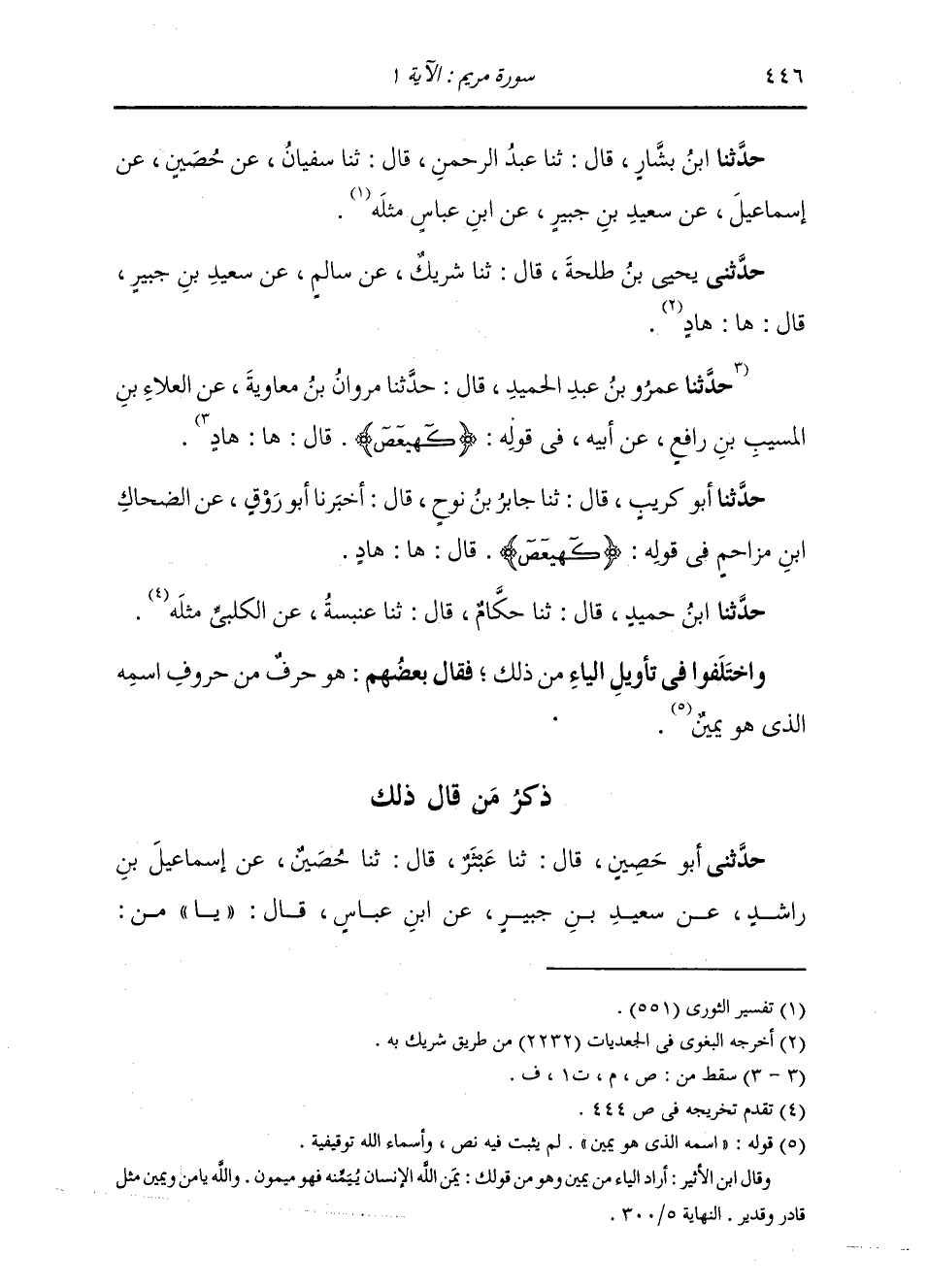 ذِكْرُ مَنْ قَالَ ذَلِكَ: حَدَّثَنِي أَبُو حُصَيْنٍ، قَالَ: ثنا عَبْثَرٌ، قَالَ: ثنا حُصَيْنٌ، عَنْ إِسْمَاعِيلَ بْنِ رَاشِدٍ، عَنْ سَعِيدِ بْنِ جُبَيْرٍ، عَنِ ابْنِ عَبَّاسٍ، قَالَ: «§يَا» مِنْ -[447]- {كهيعص} [مريم: 1] يَاءْ يَمِينٌ حَدَّثَنَا أَبُو كُرَيْبٍ، قَالَ: ثنا ابْنُ إِدْرِيسَ، قَالَ: أَخْبَرَنَا حُصَيْنٌ، عَنْ إِسْمَاعِيلَ بْنِ رَاشِدٍ، عَنْ سَعِيدِ بْنِ جُبَيْرٍ، عَنِ ابْنِ عَبَّاسٍ، مِثْلَهُ حَدَّثَنَا هَنَّادٌ، قَالَ: ثنا أَبُو الْأَحْوَصِ، عَنْ حُصَيْنٍ، عَنْ إِسْمَاعِيلَ بْنِ رَاشِدٍ، عَنْ سَعِيدِ بْنِ جُبَيْرٍ مِثْلَهُ