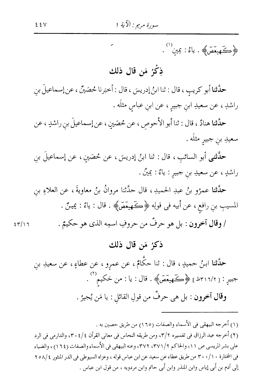 حَدَّثَنِي أَبُو السَّائِبِ، قَالَ: ثنا ابْنُ إِدْرِيسَ، عَنْ حُصَيْنٍ، عَنْ إِسْمَاعِيلَ بْنِ رَاشِدٍ، عَنْ سَعِيدِ بْنِ جُبَيْرٍ §يَاءْ: يَمِينٌ وَقَالَ آخَرُونَ: بَلْ هُوَ حَرْفٌ مِنْ حُرُوفِ اسْمِهِ الَّذِي هُوَ حَكِيمٌ