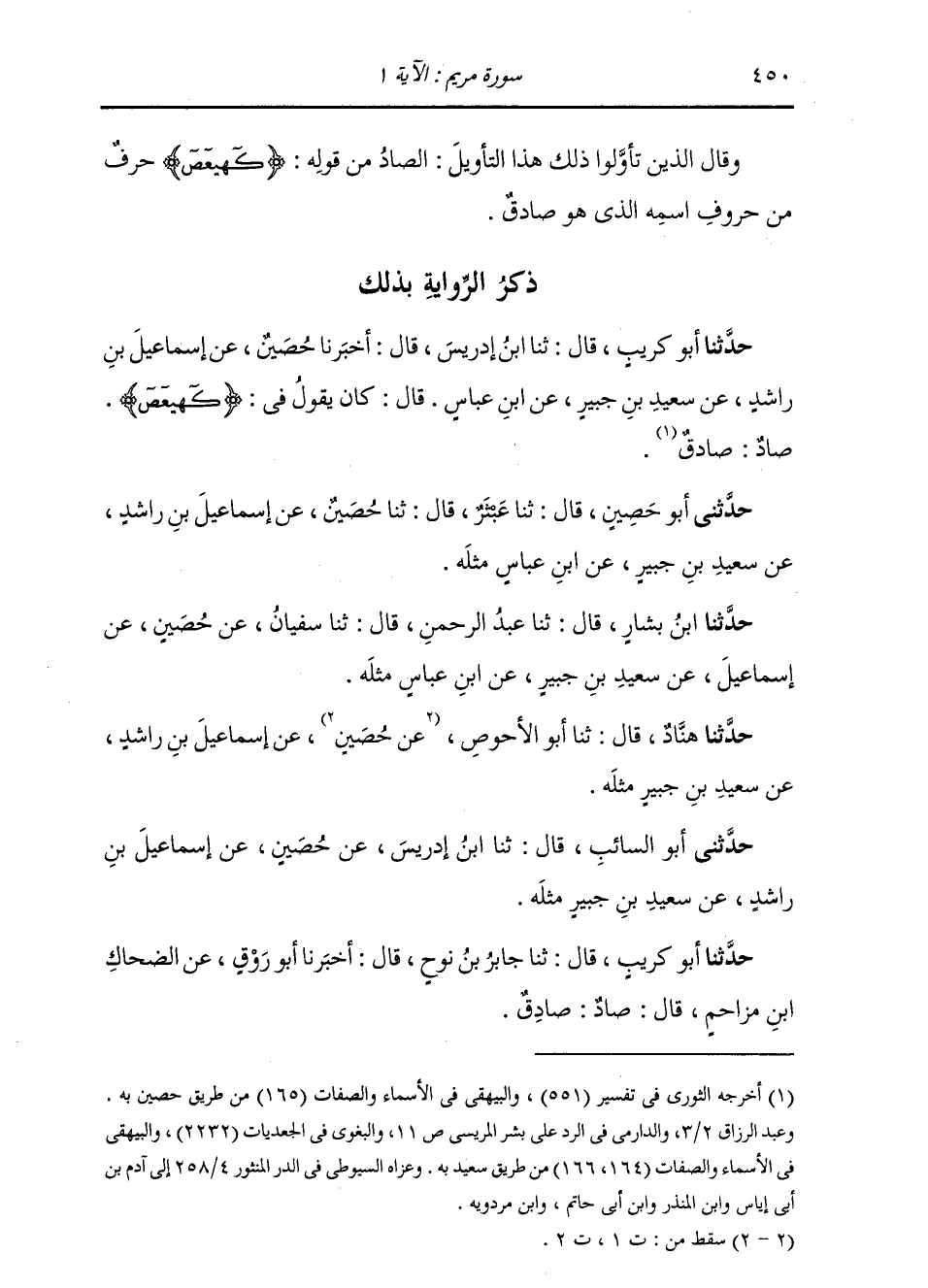 ذِكْرُ الرِّوَايَةِ بِذَلِكَ: حَدَّثَنَا أَبُو كُرَيْبٍ، قَالَ: ثنا ابْنُ إِدْرِيسَ، قَالَ: أَخْبَرَنَا حُصَيْنٌ، عَنْ إِسْمَاعِيلَ بْنِ رَاشِدٍ، عَنْ سَعِيدِ بْنِ جُبَيْرٍ، عَنِ ابْنِ عَبَّاسٍ، قَالَ: كَانَ يَقُولُ فِي {§كهيعص} [مريم: 1] صَادْ: صَادِقٌ حَدَّثَنِي أَبُو حُصَيْنٍ، قَالَ: ثنا عَبْثَرٌ، قَالَ: ثنا حُصَيْنٌ، عَنْ إِسْمَاعِيلَ بْنِ رَاشِدٍ، عَنْ سَعِيدِ بْنِ جُبَيْرٍ، عَنِ ابْنِ عَبَّاسٍ، مِثْلَهُ. حَدَّثَنَا ابْنُ بَشَّارٍ، قَالَ: ثنا عَبْدُ الرَّحْمَنِ، قَالَ: ثنا سُفْيَانُ، عَنْ حُصَيْنٍ، عَنْ إِسْمَاعِيلَ، عَنْ سَعِيدِ بْنِ جُبَيْرٍ، عَنِ ابْنِ عَبَّاسٍ مِثْلَهُ. حَدَّثَنَا هَنَّادٌ، قَالَ: ثنا أَبُو الْأَحْوَصِ، عَنْ حُصَيْنٍ، عَنْ إِسْمَاعِيلَ بْنِ رَاشِدٍ، عَنْ سَعِيدِ بْنِ جُبَيْرٍ مِثْلَهُ. حَدَّثَنِي أَبُو السَّائِبِ، قَالَ: ثنا ابْنُ إِدْرِيسَ، عَنْ حُصَيْنٍ، عَنْ إِسْمَاعِيلَ بْنِ رَاشِدٍ، عَنْ سَعِيدِ بْنِ جُبَيْرٍ مِثْلَهُ