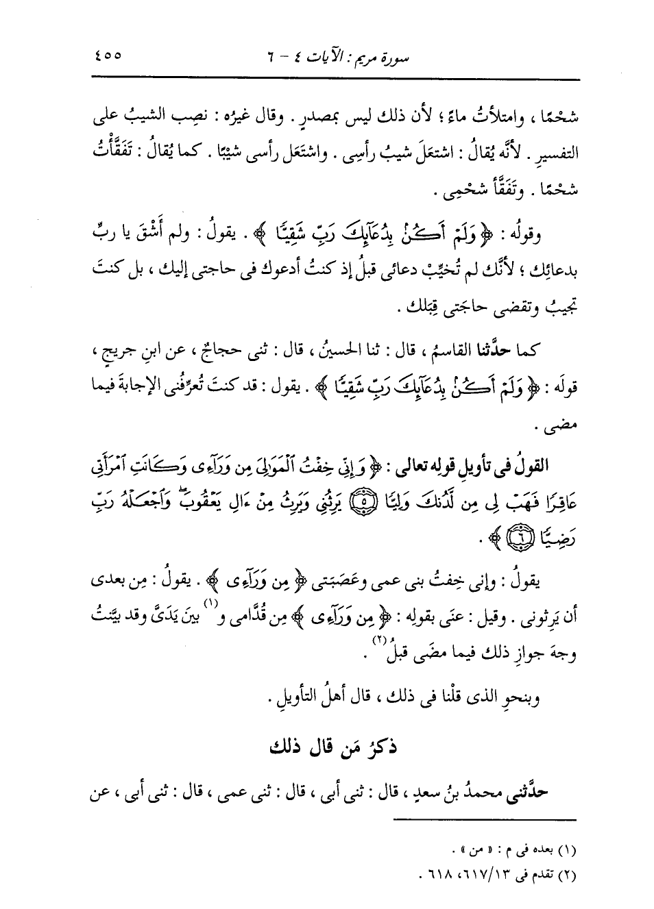 §الْقَوْلُ فِي تَأْوِيلِ قَوْلِهِ تَعَالَى: {وَإِنِّي خِفْتُ الْمَوَالِيَ مِنْ وَرَائِي وَكَانَتِ امْرَأَتِي عَاقِرًا فَهَبْ لِي مِنْ لَدُنْكَ وَلِيًّا يَرِثُنِي وَيَرِثُ مِنْ آلِ يَعْقُوبَ وَاجْعَلْهُ رَبِّ رَضِيًّا} [مريم: 6] يَقُولُ: وَإِنِّي خِفْتُ بَنِي عَمِّي وَعَصَبَتِي مِنْ وَرَائِي. يَقُولُ: مِنْ بَعْدِي أَنْ يَرِثُونِي، وَقِيلَ: عَنَى بِقَوْلِهِ {مِنْ وَرَائِي} [مريم: 5] مِنْ قُدَّامِي وَمِنْ بَيْنِ يَدَيَّ، وَقَدْ بَيَّنْتُ جَوَازَ ذَلِكَ فِيمَا مَضَى قَبْلُ. وَبِنَحْوِ الَّذِي قُلْنَا فِي ذَلِكَ قَالَ أَهْلُ التَّأْوِيلِ