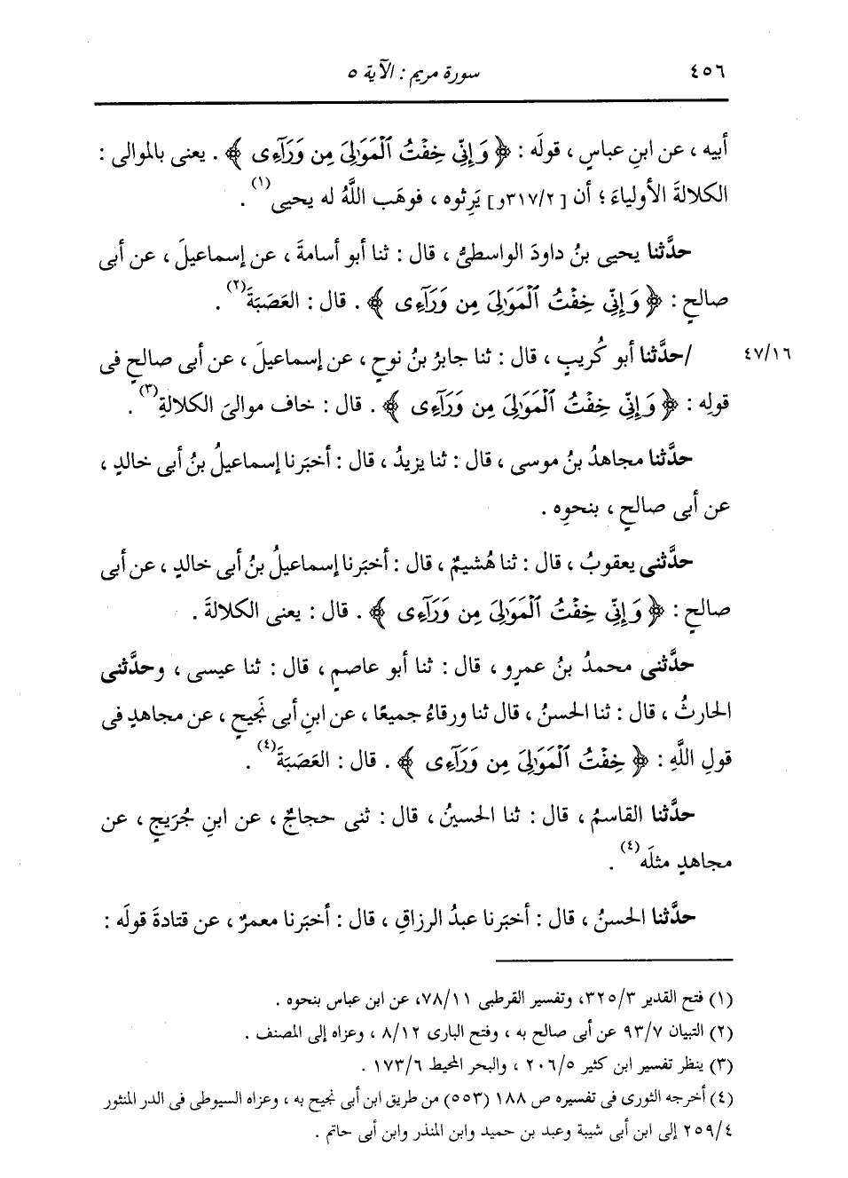 حَدَّثَنَا أَبُو كُرَيْبٍ، قَالَ: ثنا جَابِرُ بْنُ نُوحٍ، عَنْ إِسْمَاعِيلَ، عَنْ أَبِي صَالِحٍ فِي قَوْلِهِ {§وَإِنِّي خِفْتُ الْمَوَالِيَ مِنْ وَرَائِي} [مريم: 5] قَالَ: خَافَ مَوَالِي الْكَلَالَةِ حَدَّثَنَا مُجَاهِدُ بْنُ مُوسَى، قَالَ: ثنا يَزِيدُ، قَالَ: أَخْبَرَنَا إِسْمَاعِيلُ بْنُ أَبِي خَالِدٍ، عَنْ أَبِي صَالِحٍ بِنَحْوِهِ